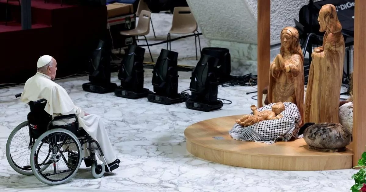 Papa Francisco Emite un Llamado de Paz en Gaza con el Niño Jesús obre una Kufiya, Pañuelo Palestino, en el Pesebre