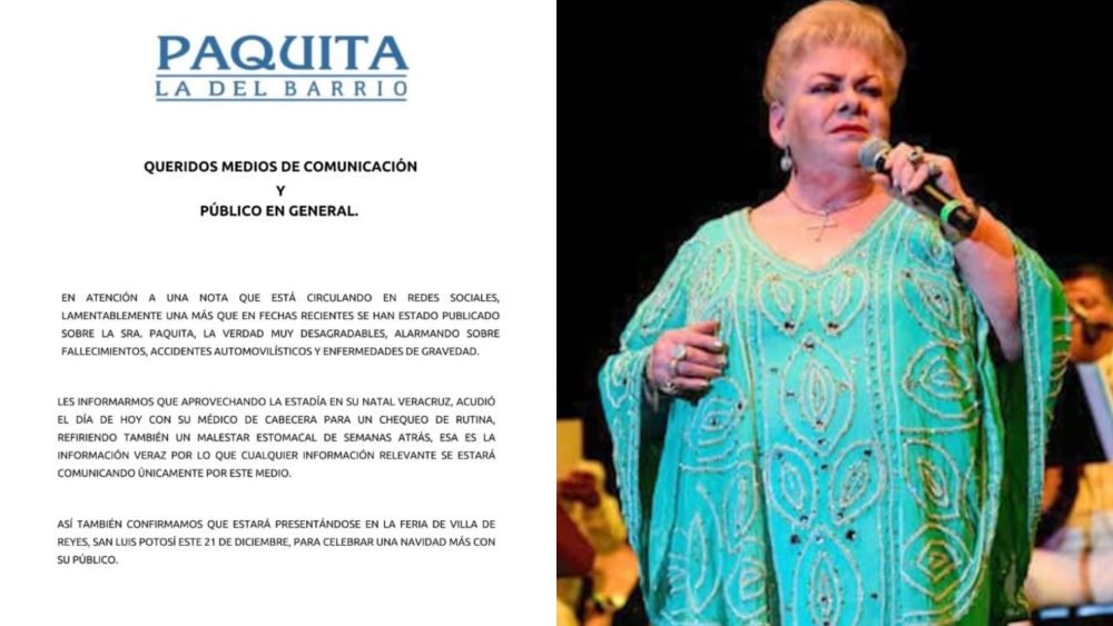 Aunado a este comunicado, Francisco Torres, representante de Paquita la del Barrio, reiteró que la cantante está bien de salud, desmintiendo que esté hospitalizada y en terapia intensiva, “nos hemos acostumbrado mucho a notas falsas, que ya se murió, que se volteó la camioneta”, dijo en entrevista en el programa “De primera mano”. Su malestar estomacal, al parecer, se debe a una bacteria, por lo que estará en chequeos médicos.