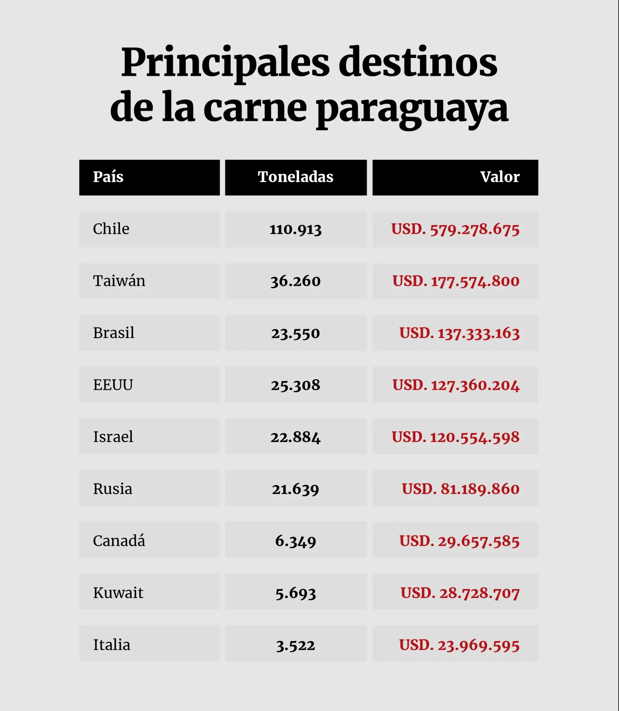 El mercado chileno continúa siendo el principal destino de la carne paraguaya, absorbiendo el 36 % de las exportaciones, con 110.913 t por USD 580 millones. Le siguen Taiwán (11 %) y Brasil (9 %). Sin embargo, destaca la incursión de Estados Unidos en cuarto lugar, con el 8 % de los envíos. Hasta noviembre, Estados Unidos importó 25.308 t, generando ingresos por USD 127,3 millones.