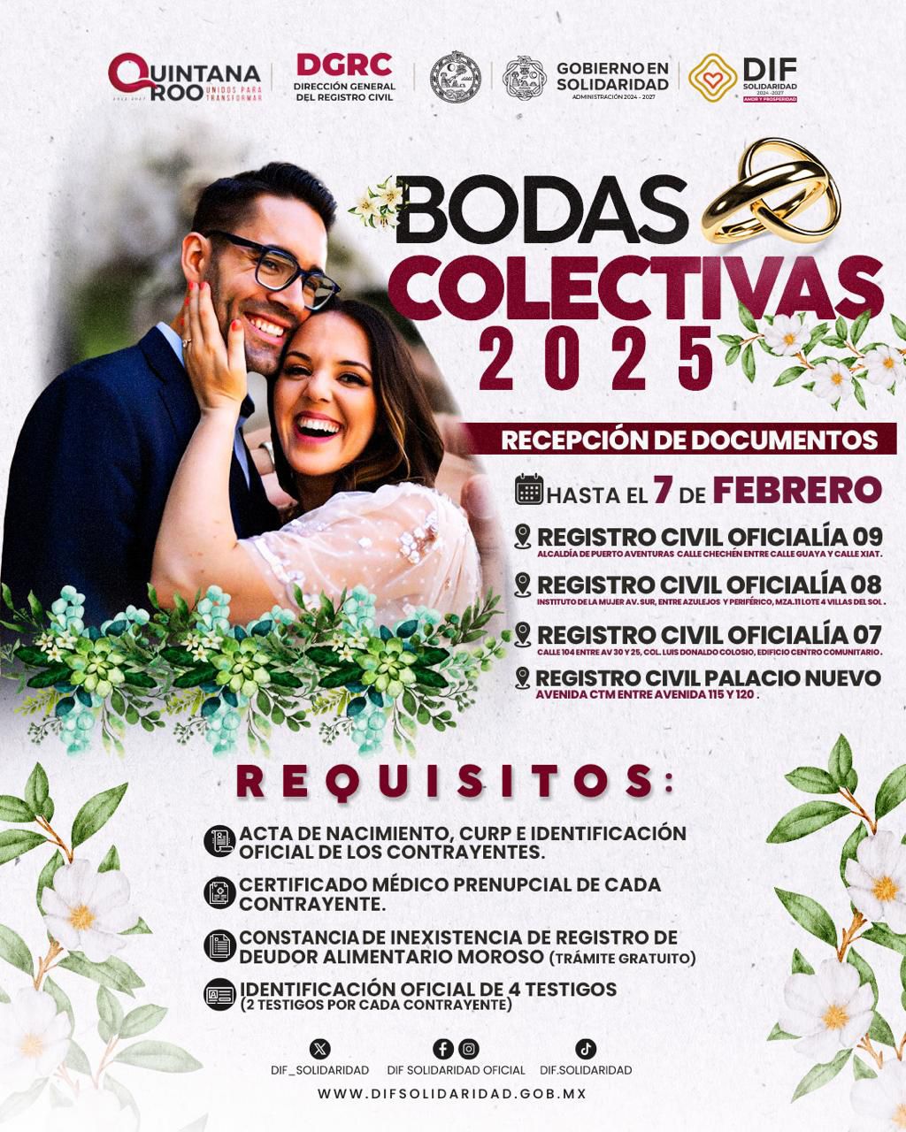 Con el objetivo de otorgar certeza jurídica y regularizar el estado civil de las personas de nacionalidad mexicana, así como de parejas de ambos sexos que viven en unión libre, el Sistema DIF Solidaridad, bajo la dirección de su presidente honorario, Eduardo Asencio, invita a los interesados a participar en las “Bodas Colectivas 2025”, que se llevarán a cabo en el mes de febrero.