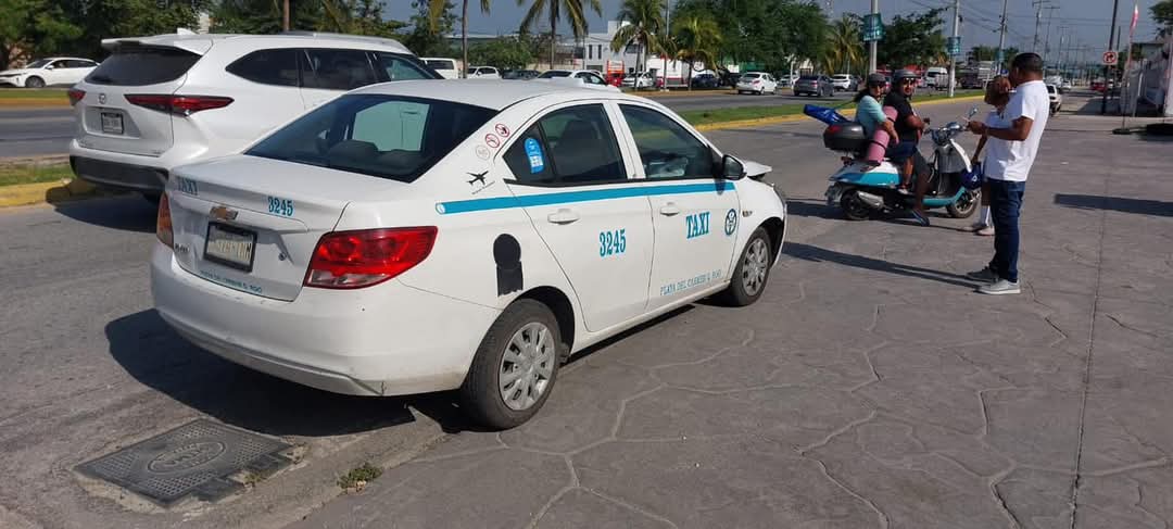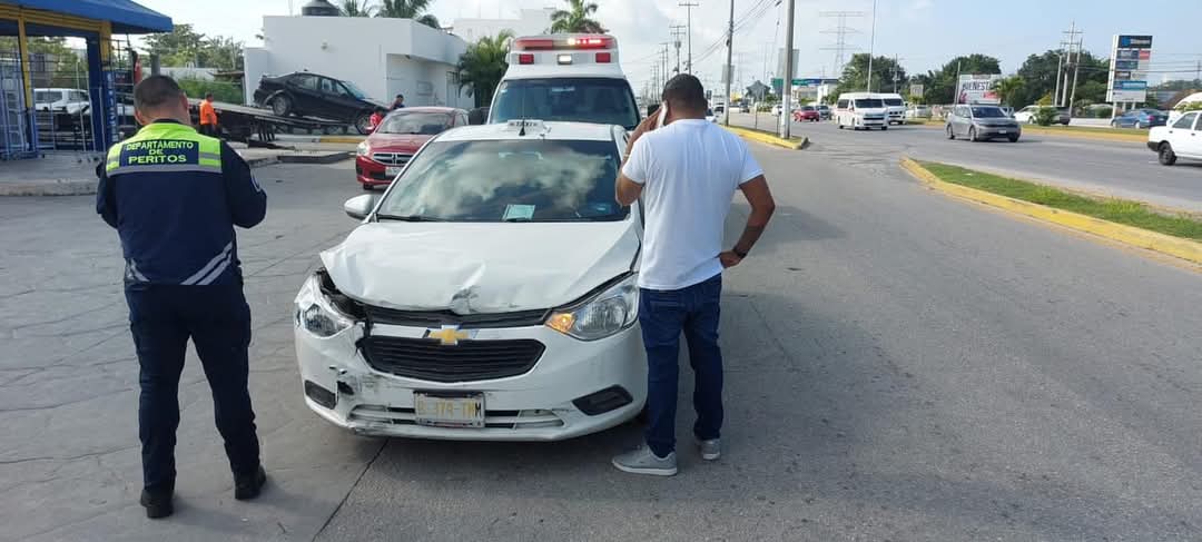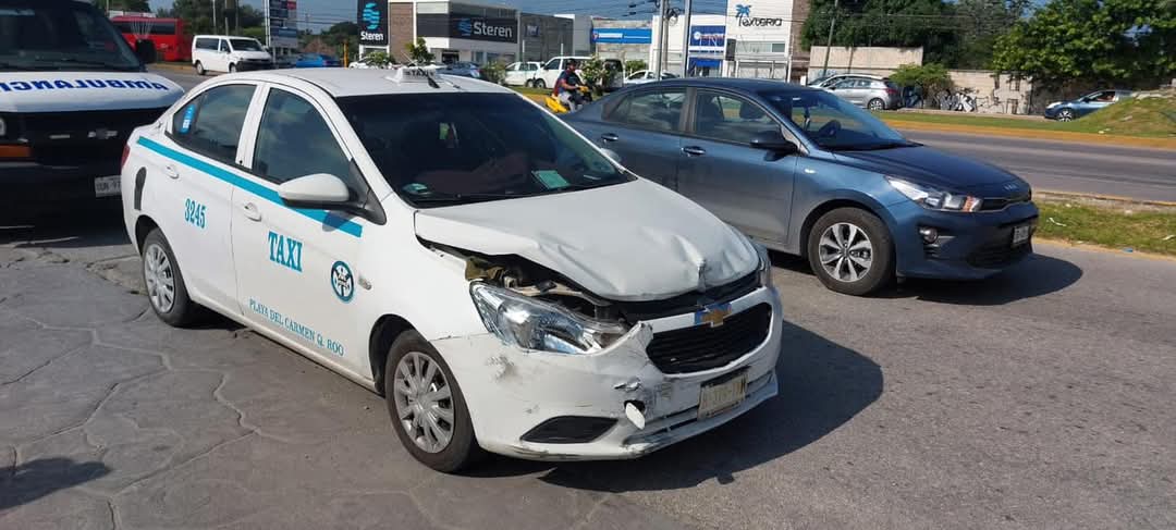 Playa del Carmen, 11 de enero.- Se registra fuerte accidente entre un autobús particular y un taxi del Sindicato Lázaro Cárdenas del Río, cuyo pasajero y operador resultaron lesionados tras la fuerte colisión sobre el bulevar Playa del Carmen con avenida Luis Donaldo Colosio.