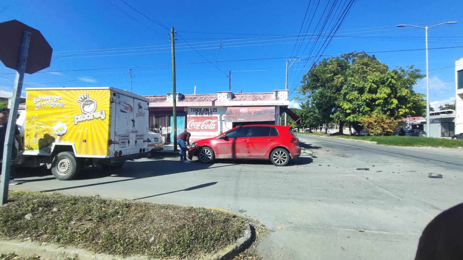 CHETUMAL, 22 de noviembre. – Un choque vehicular ocurrido en la esquina de las avenidas Independencia y Bugambilias dejó únicamente daños materiales, luego de que el conductor de una camioneta repartidora de la marca “Pico Rey” se volara el alto obligatorio y colisionara contra un automóvil Volkswagen Golf de color rojo.