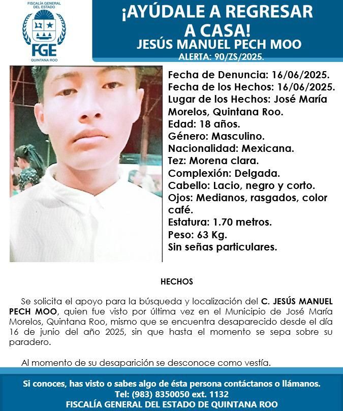 José María Morelos, 17 de junio.- Aunque la Fiscalía continúa con la búsqueda activa de Jesús Manuel Pech Moo, uno de los jóvenes reportados como desaparecidos en días recientes, un reporte telefónico generado en la madrugada del lunes dejó abierta la posibilidad de que el muchacho se encuentre a salvo en el municipio de Felipe Carrillo Puerto.