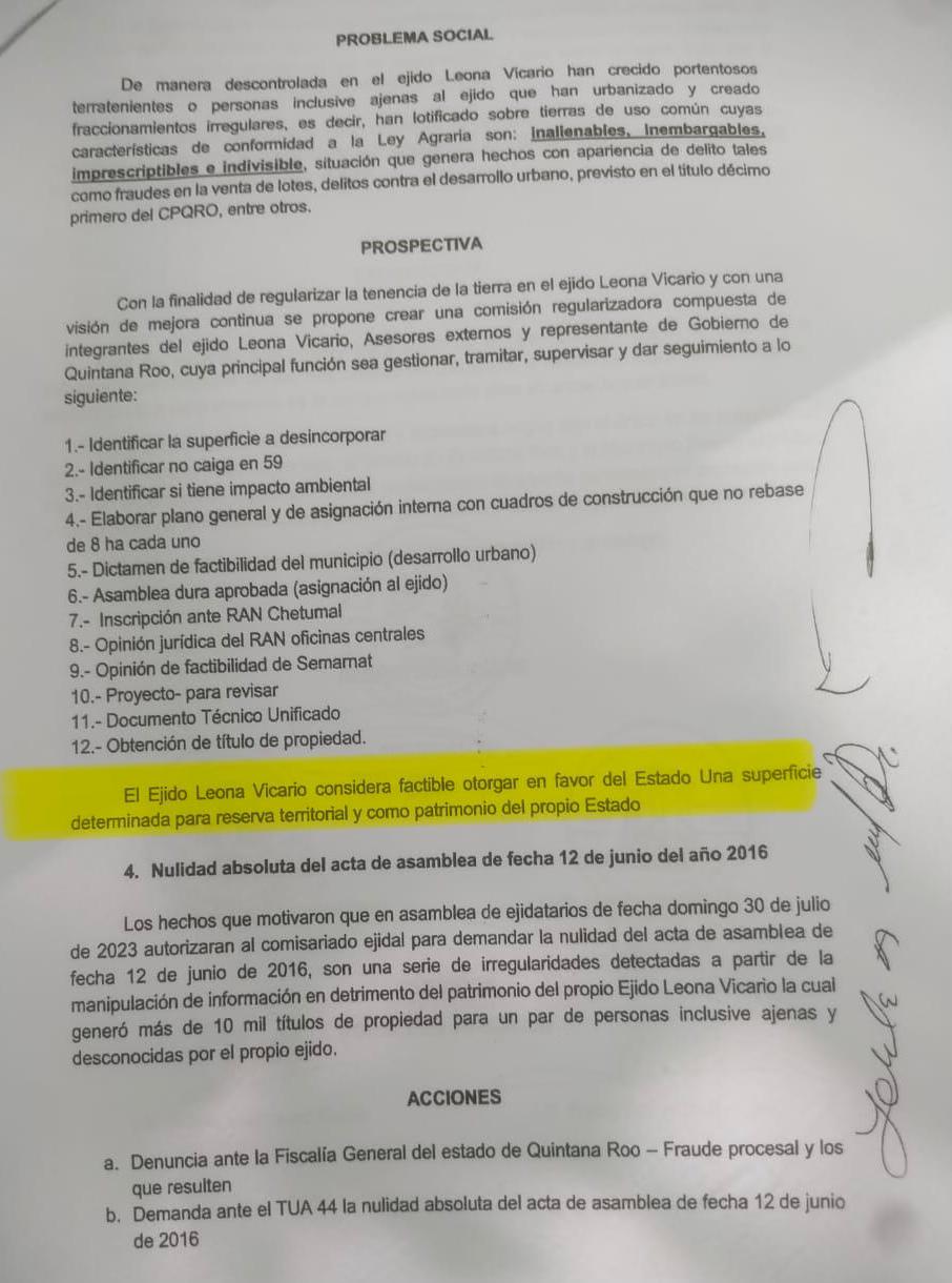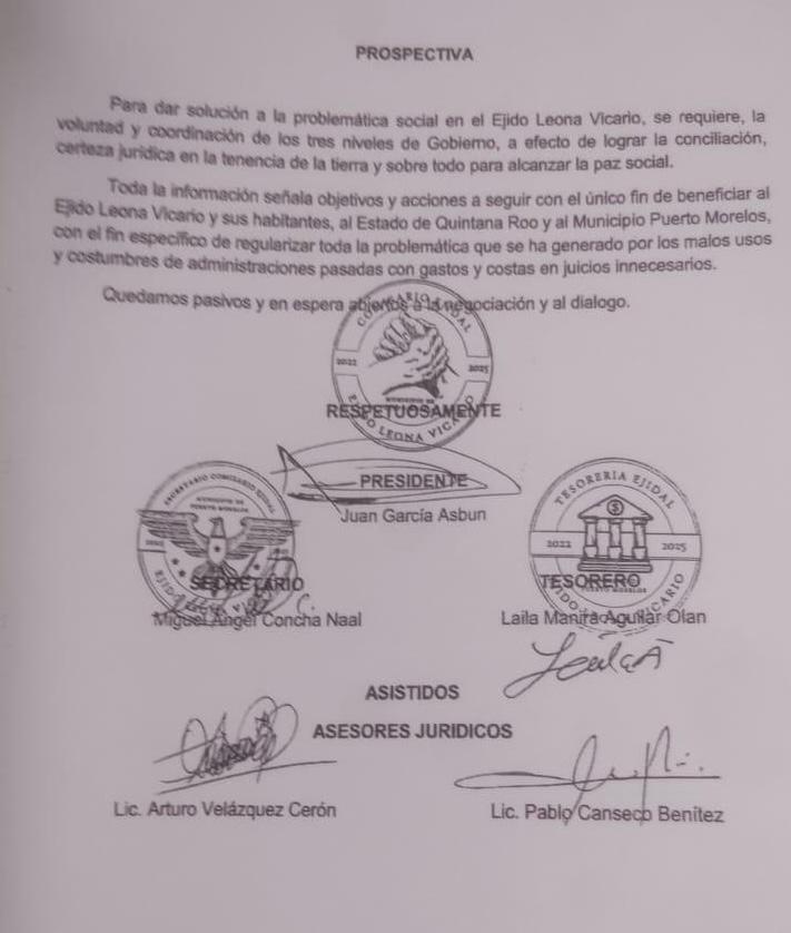 Semanas antes, según documentos consultados, el presidente del comisariado Juan García Asbun, la tesorera Laila Manira Aguilar Olán y el secretario Miguel Ángel Concha Naal firmaron a espaldas de la asamblea un documento donde “se considera factible otorgar en favor del Estado una superficie determinada para reserva territorial y como patrimonio del propio Estado”.