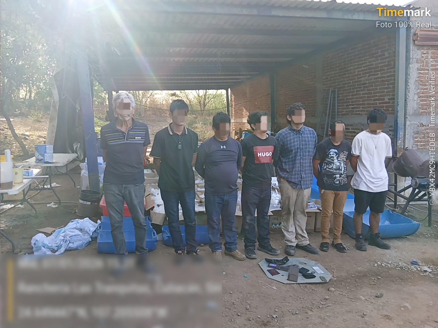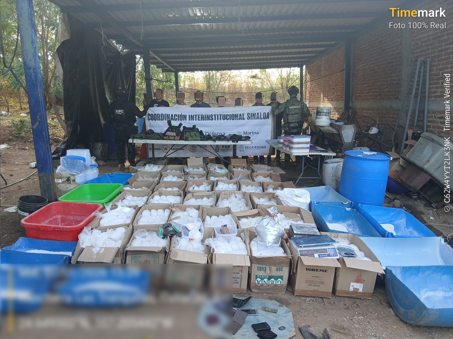 En una segunda acción, en coordinación interinstitucional personal naval localizó y aseguró una bodega de almacenamiento de drogas sintéticas en inmediaciones del poblado de Las Tranquitas, Culiacán, Sinaloa, donde fueron detenidos siete presuntos infractores de la ley.