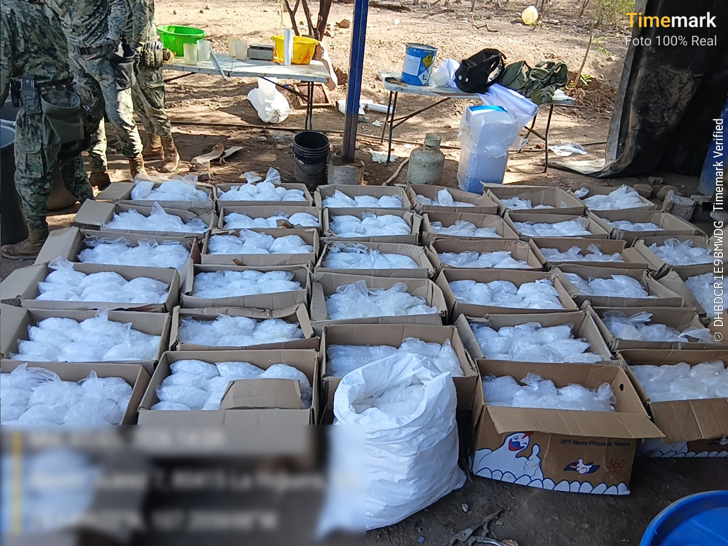 Asimismo, fueron asegurados aproximadamente 1,000 kilogramos de producto terminado con características similares a la metanfetamina, aproximadamente 12 kilogramos de producto en seco con características similares a la metanfetamina, diversos precursores químicos, vehículos, armamento, cargadores y cartuchos de diferentes calibres.