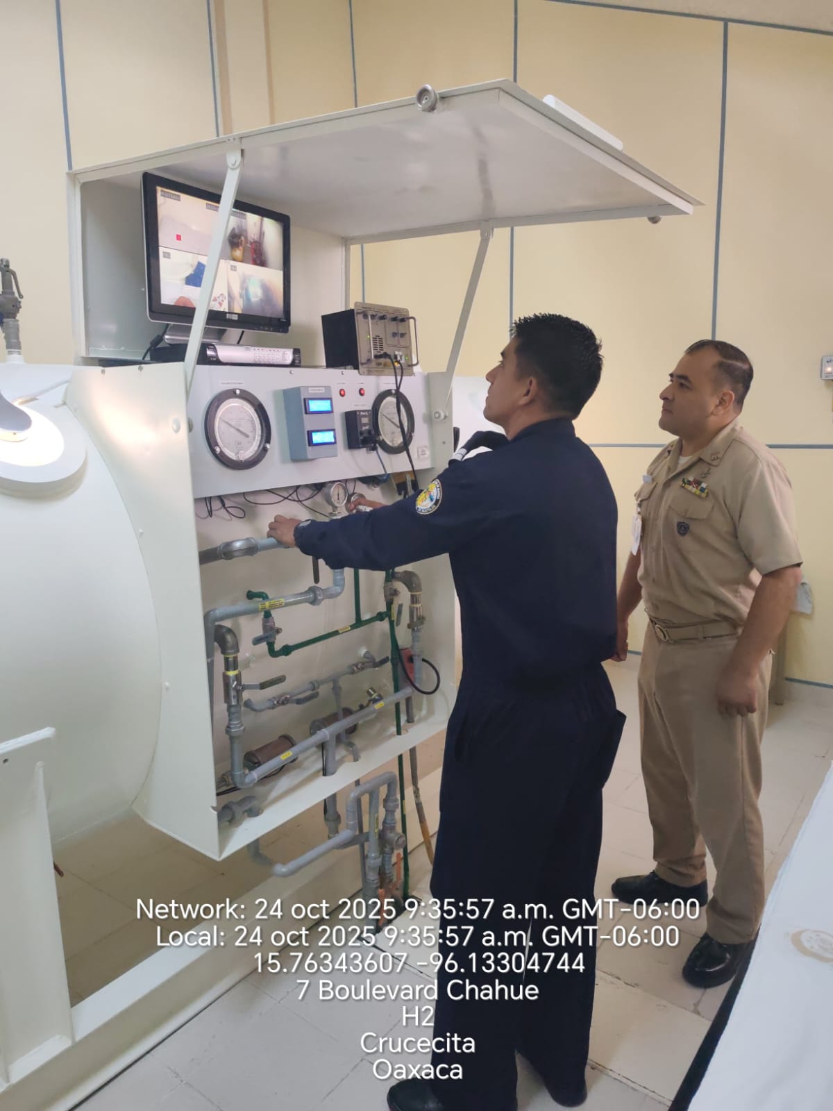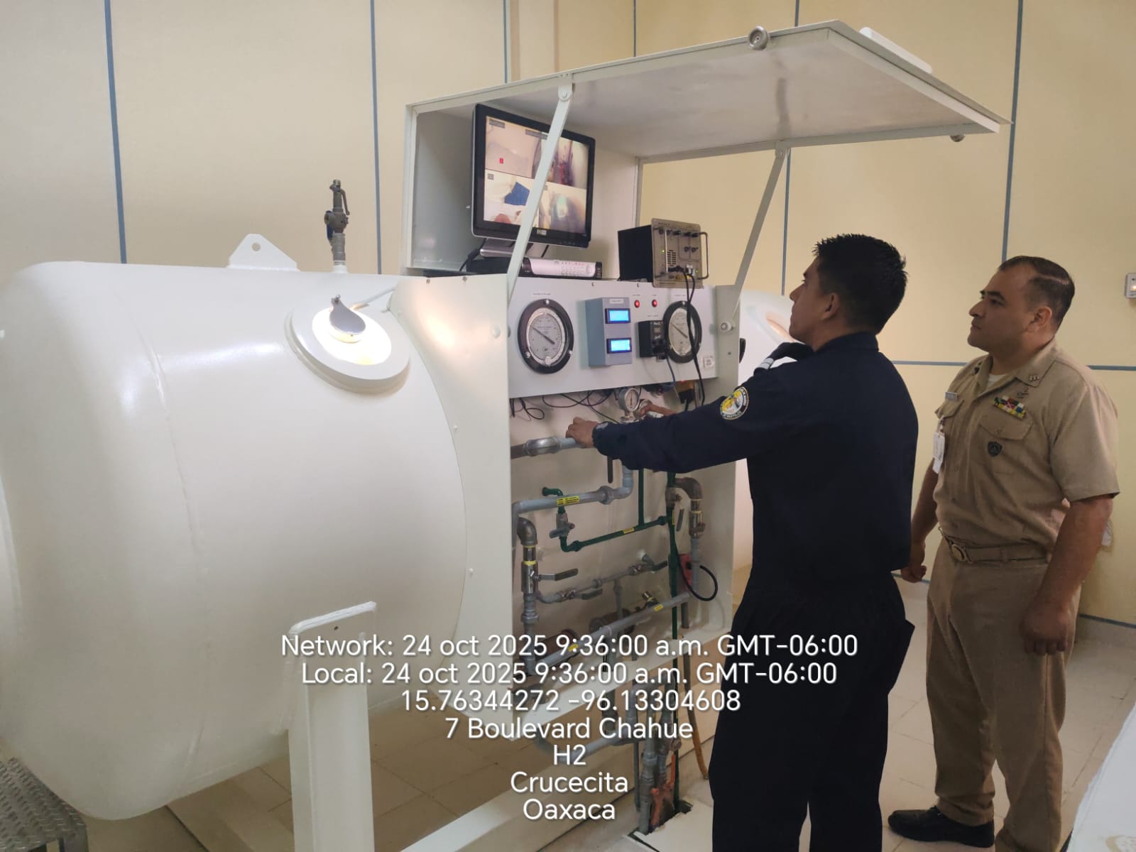 Por lo anterior, personal de Sanidad Naval perteneciente al Hospital Naval de Huatulco, evaluó el estado de salud del paciente y le brindó atención médica con la cámara hiperbárica, proporcionándole el protocolo de tratamiento más adecuado.