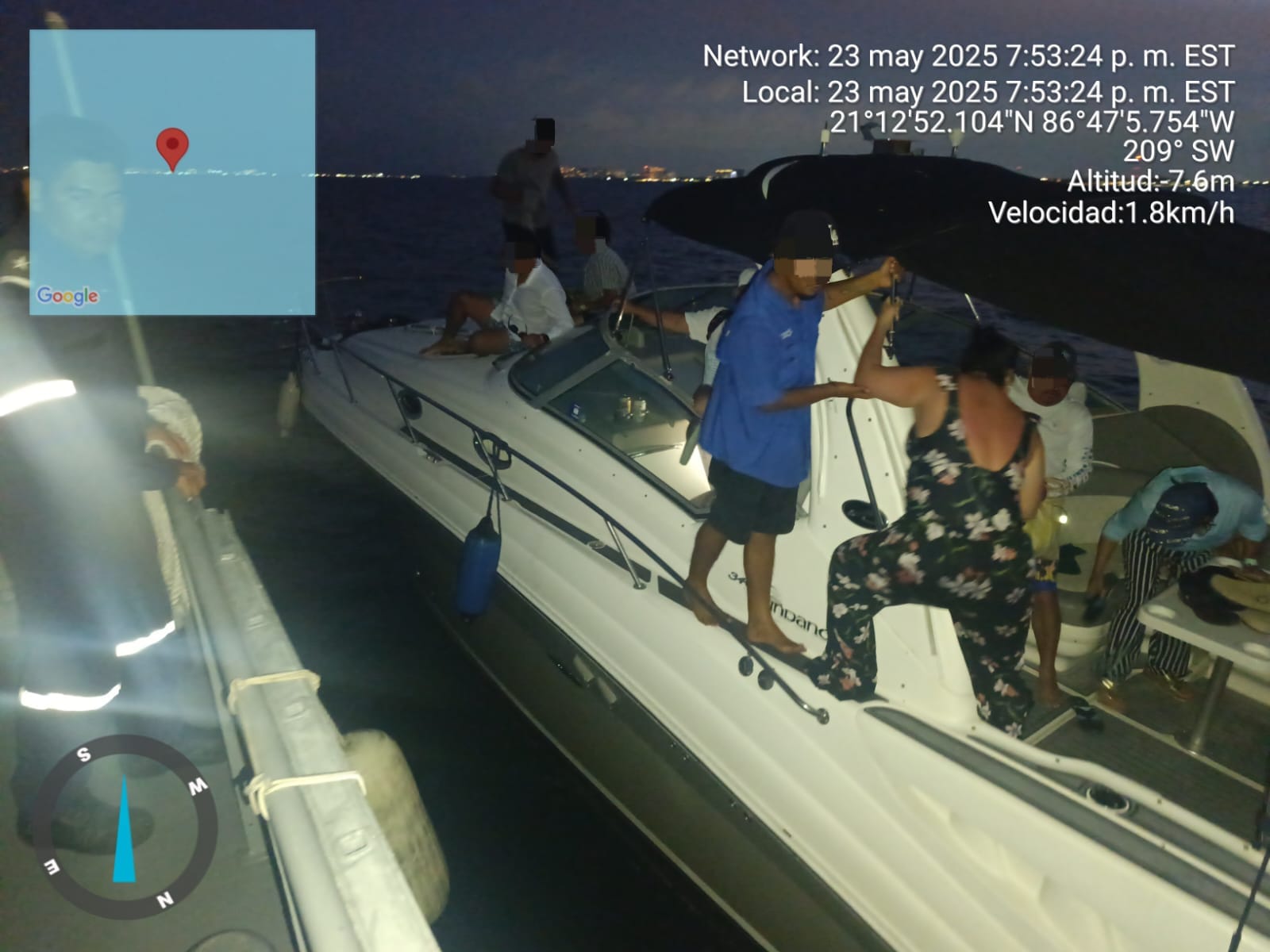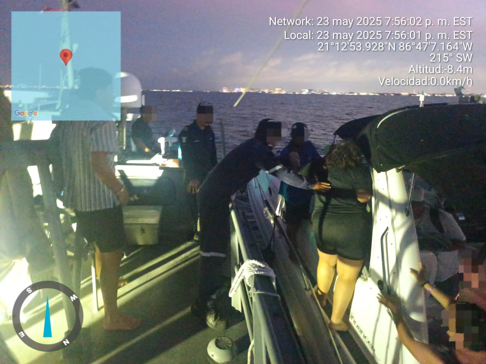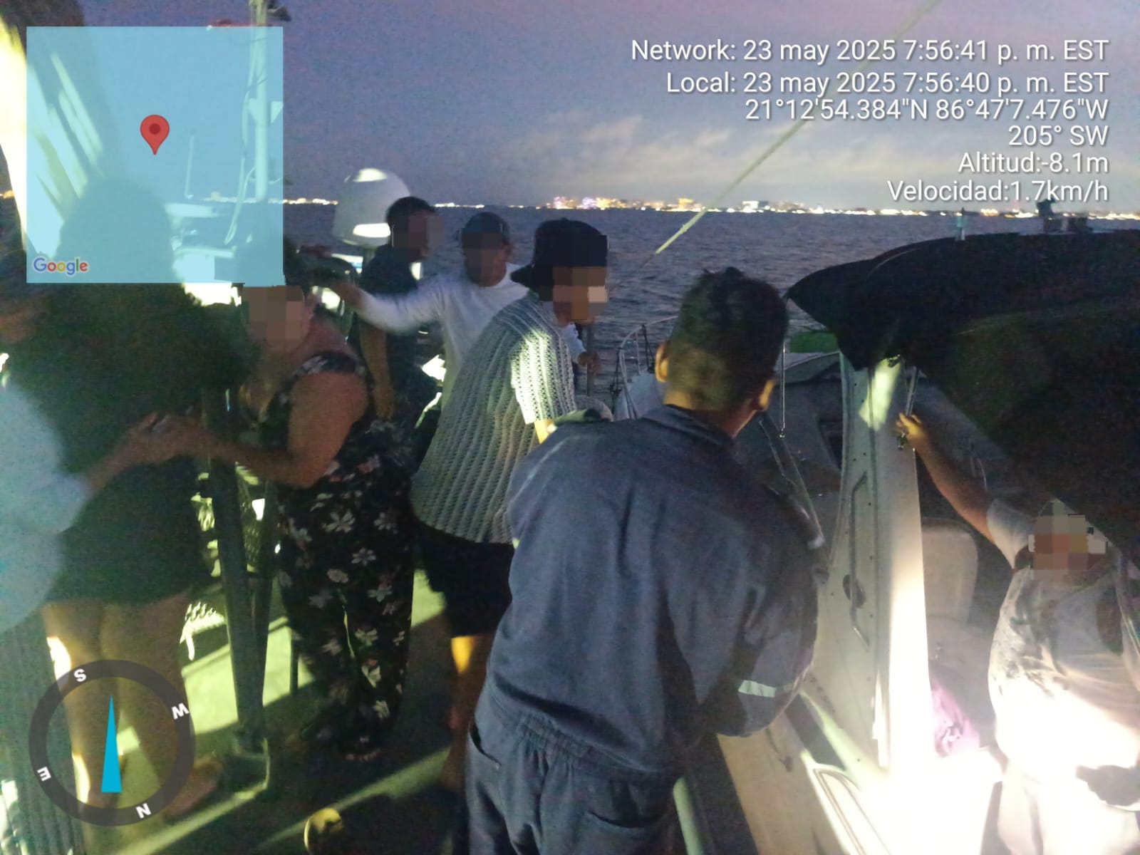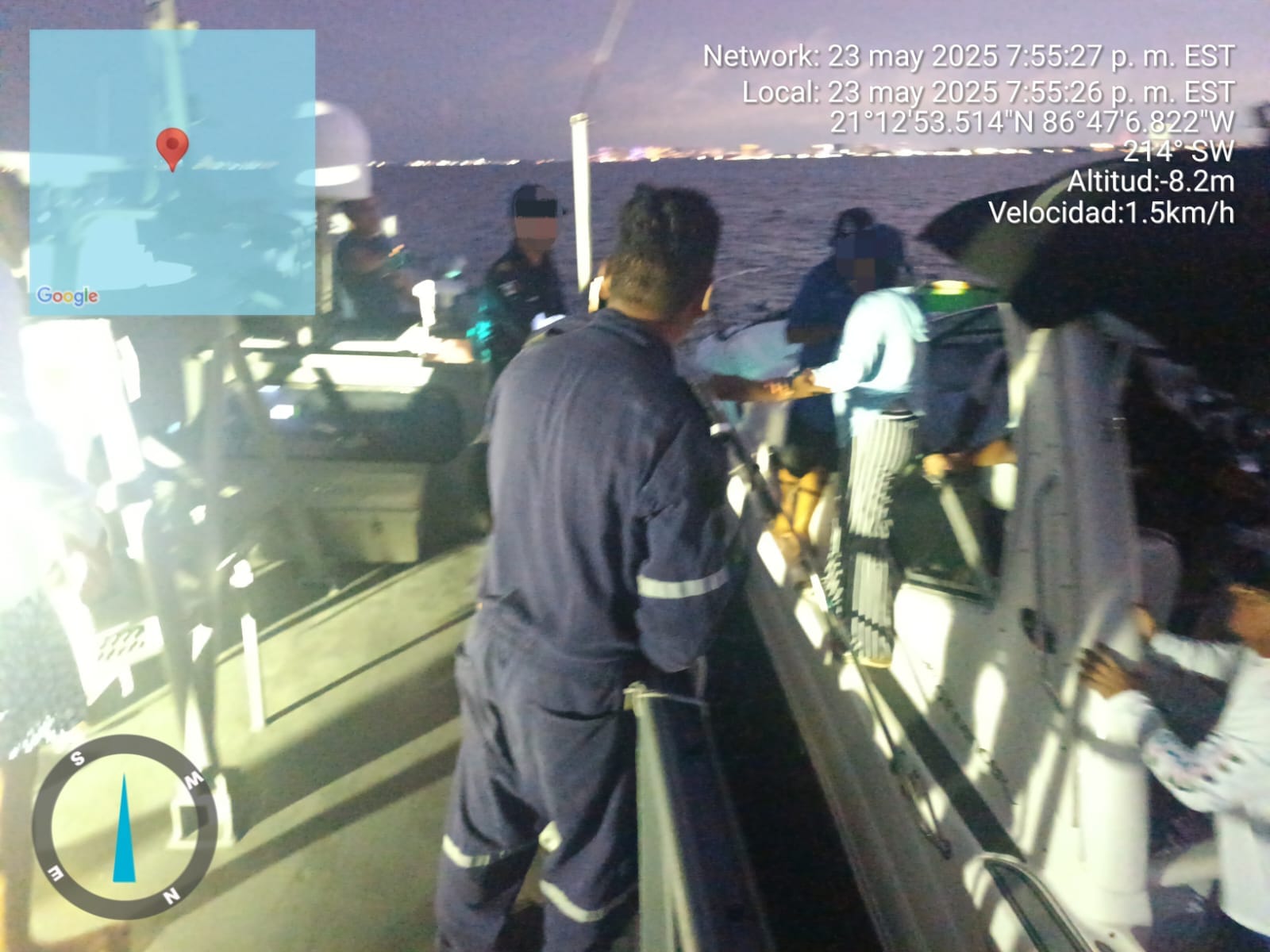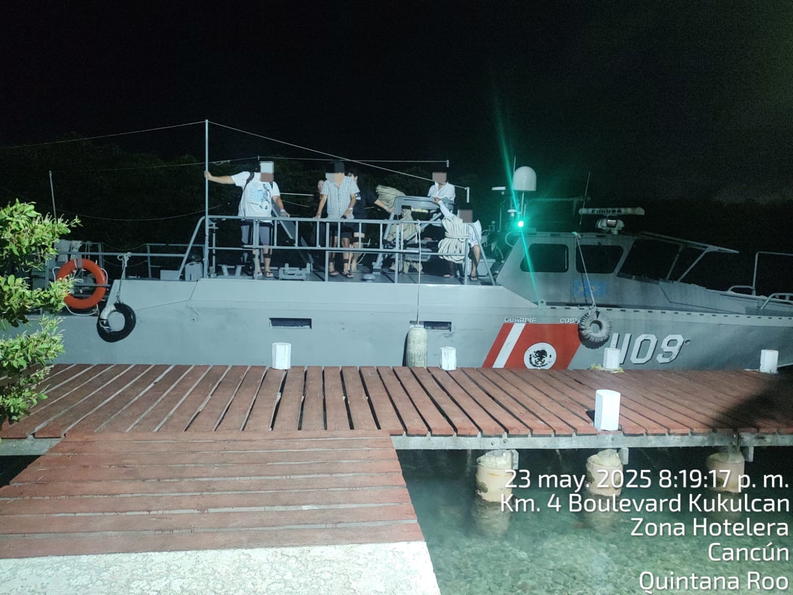 Derivado de lo anterior, y con el fin de salvaguardar la vida humana en la mar, se desplegó una Patrulla Interceptora de la Quinta Región Naval, la cual localizó a citada embarcación siendo remolcada, por lo que los pasajeros fueron trasladados hacia la Estación Naval Avanzada de Playa Linda, Quintana Roo.