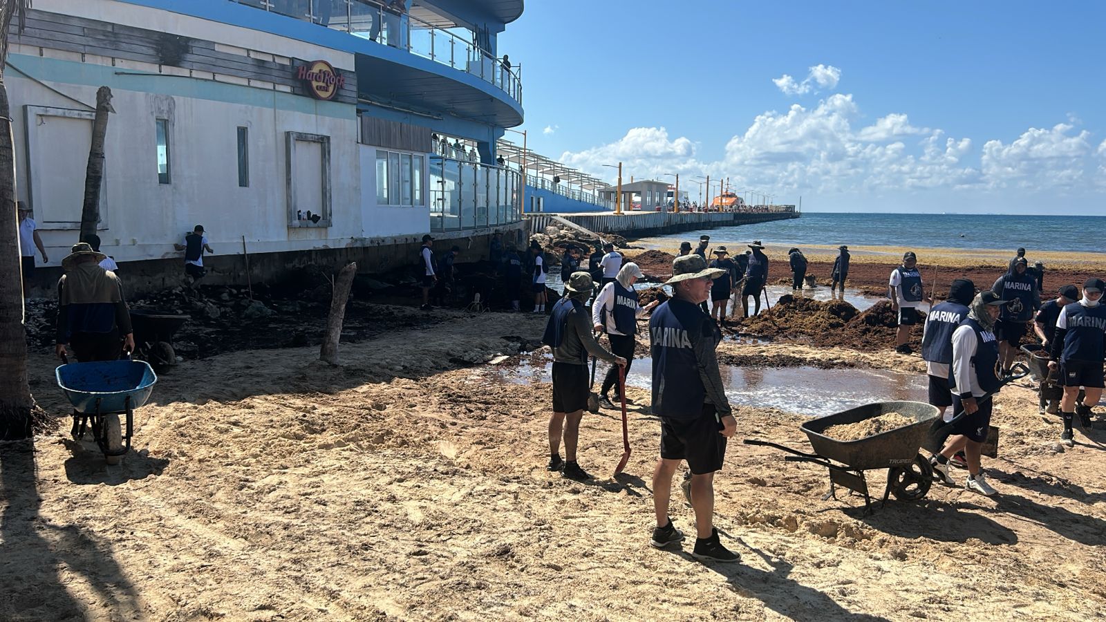 Personal Naval Efectúa Limpieza de Sargazo en Playa del Carmen, Quintana Roo