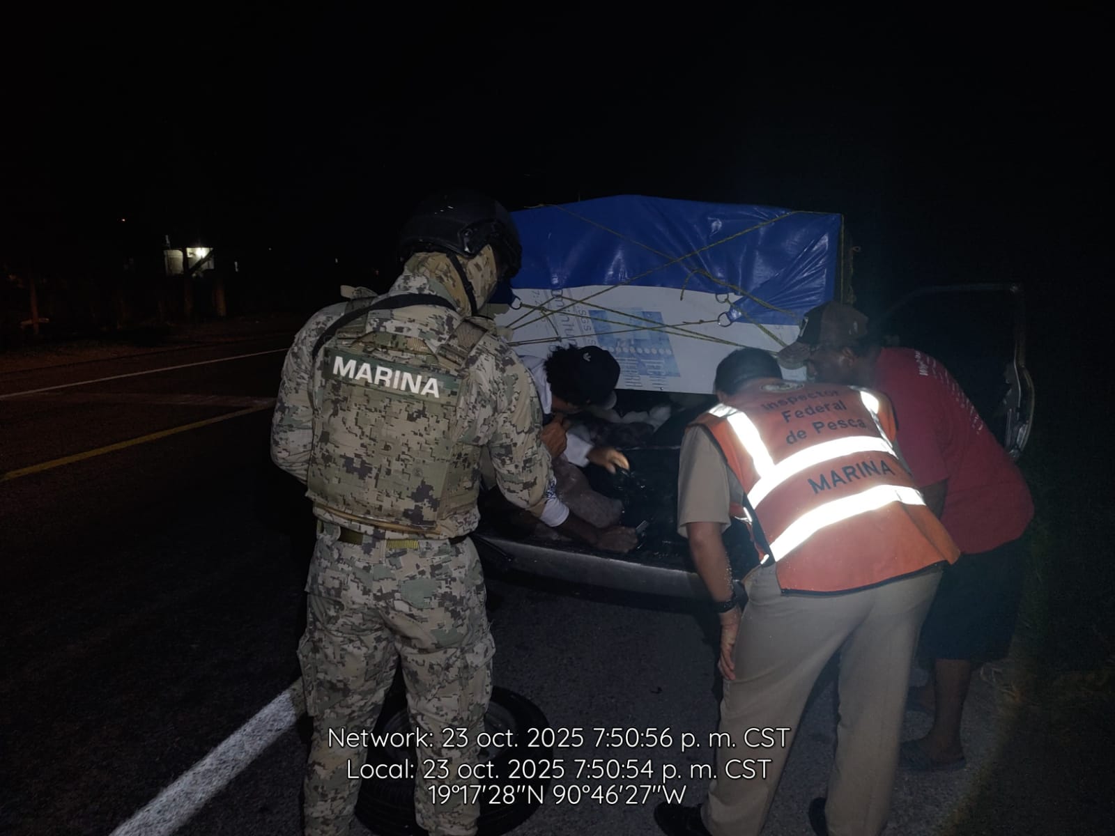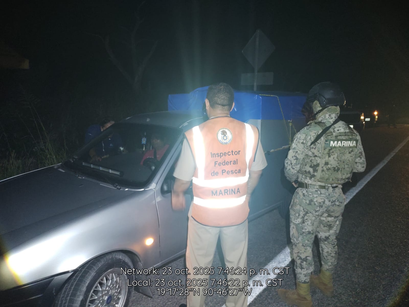 Durante citado recorrido, se inspeccionó un vehículo del estado de Tabasco, con un pasajero a bordo, a quién se le retuvieron precautoriamente aproximadamente 140 kilogramos de Pulpo Maya entero enhielado, así como el vehículo en el que lo transportaba, por no acreditar su legal procedencia. Cabe desatacar que el producto pesquero quedó bajo resguardo de personal de Conapesca para determinar su situación legal.