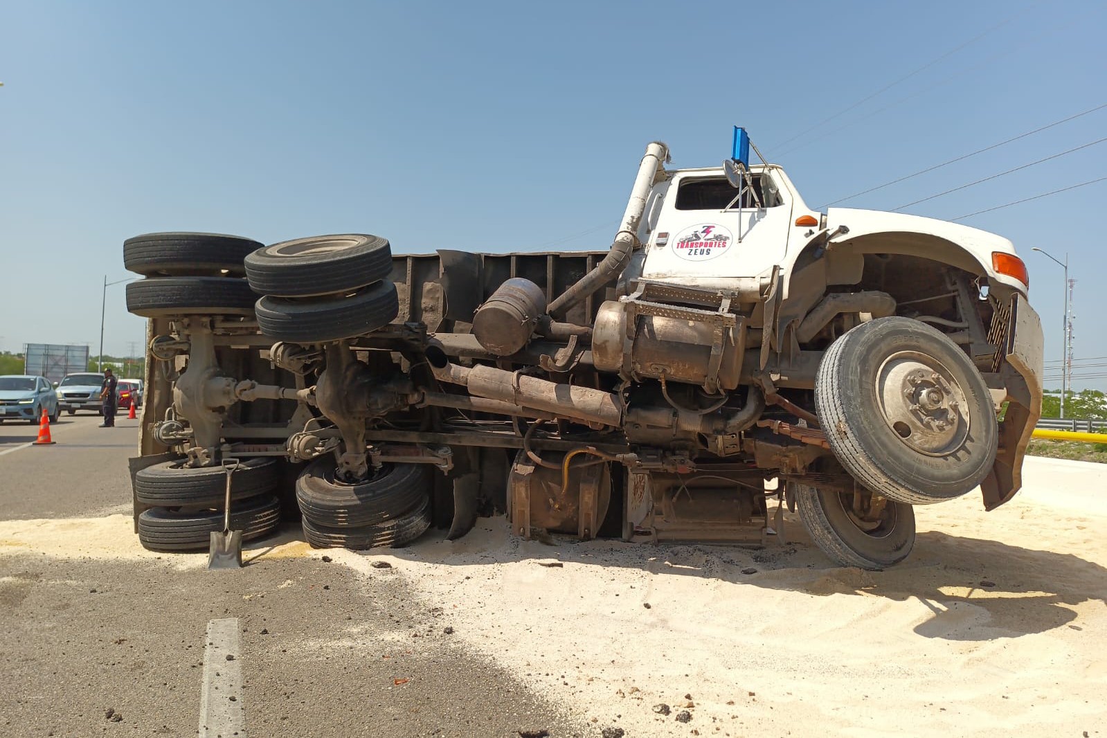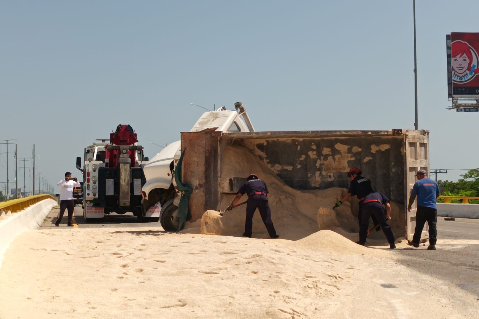 Pesada Unidad Cargada con Toneladas de Arena Volcó Sobre el Puente de Xcanatún en la Mérida-Progreso