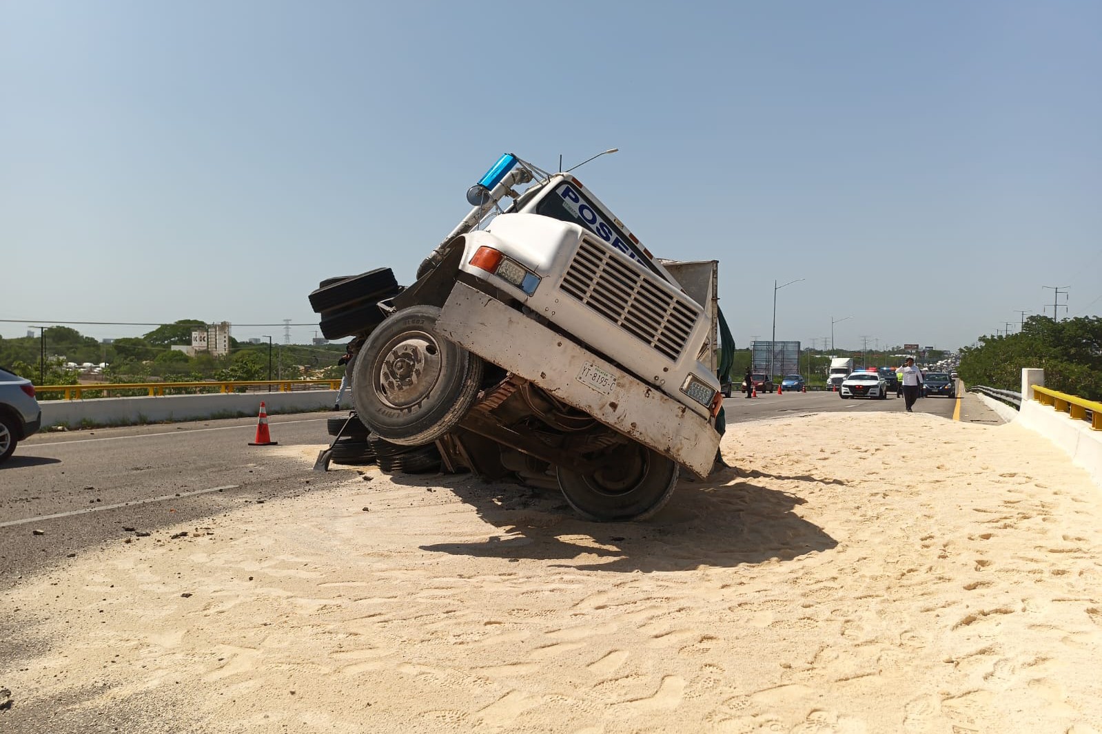 Pesada Unidad Cargada con Toneladas de Arena Volcó Sobre el Puente de Xcanatún en la Mérida-Progreso