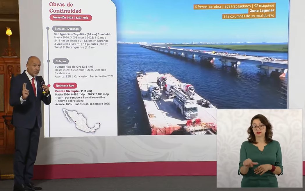 También informó que la inversión hasta el momento es de 6 mil 486 millones de pesos hasta el 2024, con presupuesto de 2 mil 100 millones de pesos asignados este 2025.