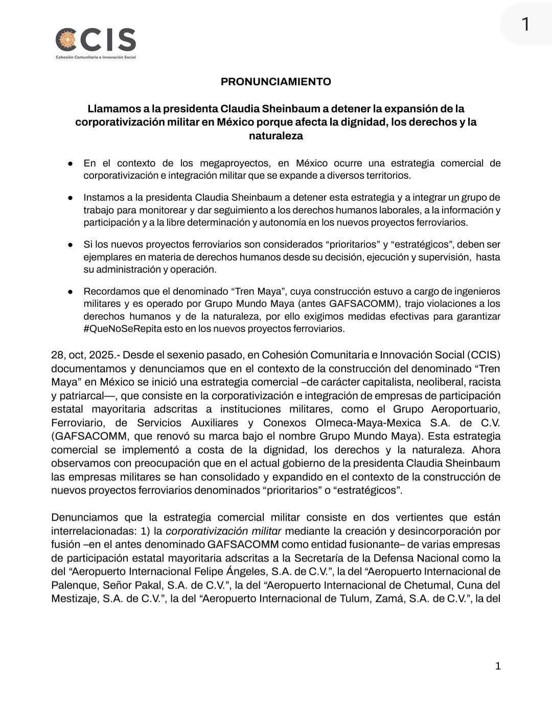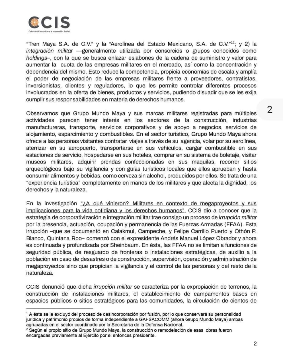 CCIS emitió un comunicado en donde expone que la militarización económica se consolidó con la creación de empresas controladas por las secretarías de la Defensa Nacional (Sedena) y de Marina, que operan proyectos estratégicos como el Tren Maya.