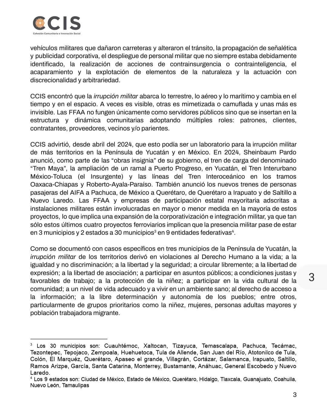 Es urgente detener la expansión militar en el país, consideró la organización Cohesión Comunitaria e Innovación Social (CCIS), quien hizo un llamado a la Presidenta Claudia Sheinbaum Pardo a quien pidieron poner un alto a la corporativización militar en México, denunciando que esta estrategia ha impactado directamente en los derechos humanos, la naturaleza y las condiciones laborales en los Estados de Campeche y Quintana Roo.