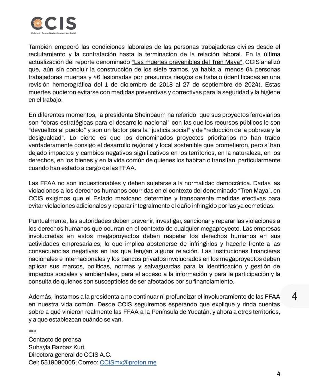 La organización exigió al Estado Mexicano adoptar medidas efectivas para prevenir, investigar y sancionar las v¡olaciones a derechos humanos derivadas de los megaproyectos ferroviarios, y pidió a la presidenta Sheinbaum detener la expansión de la corporativización militar, al tiempo que demandó transparencia sobre la presencia de las Fuerzas Armadas en la Península de Yucatán.