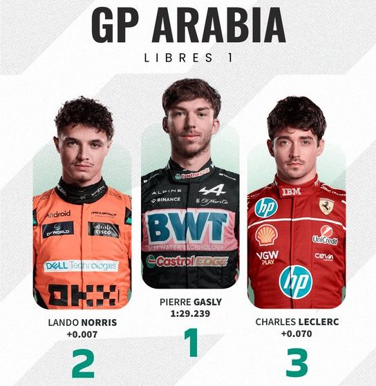 ¡GASLY VOLÓ EN LA P1! 🔥#F1xFSMX | El piloto de Albon marcó el mejor tiempo de 1:29.239, dejando a Norris en segundo y Leclerc en tercero #SaudiArabiaGP pic.twitter.com/YYRC2yxtdb