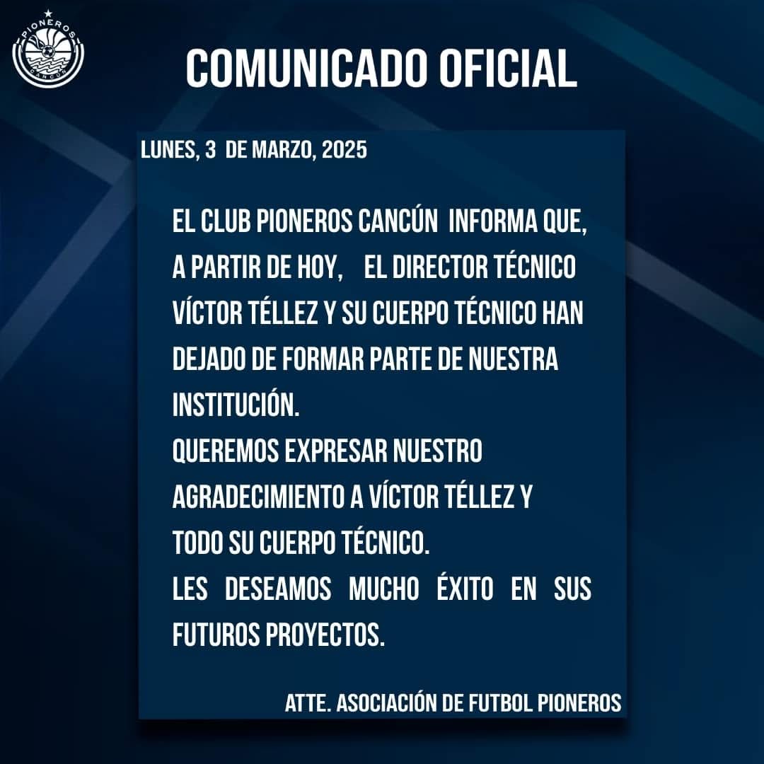A través de una publicación en sus redes sociales, la directiva pionera, encabezada por Daniel Arreola Argüello, dio a conocer que a partir de este lunes 3 de marzo, Víctor Téllez Silva y su cuerpo técnico, han dejado de ser parte de la institución, al tiempo de agradecerles su compromiso con los Pioneros y desearles el mayor de los éxitos en sus proyectos futuros.