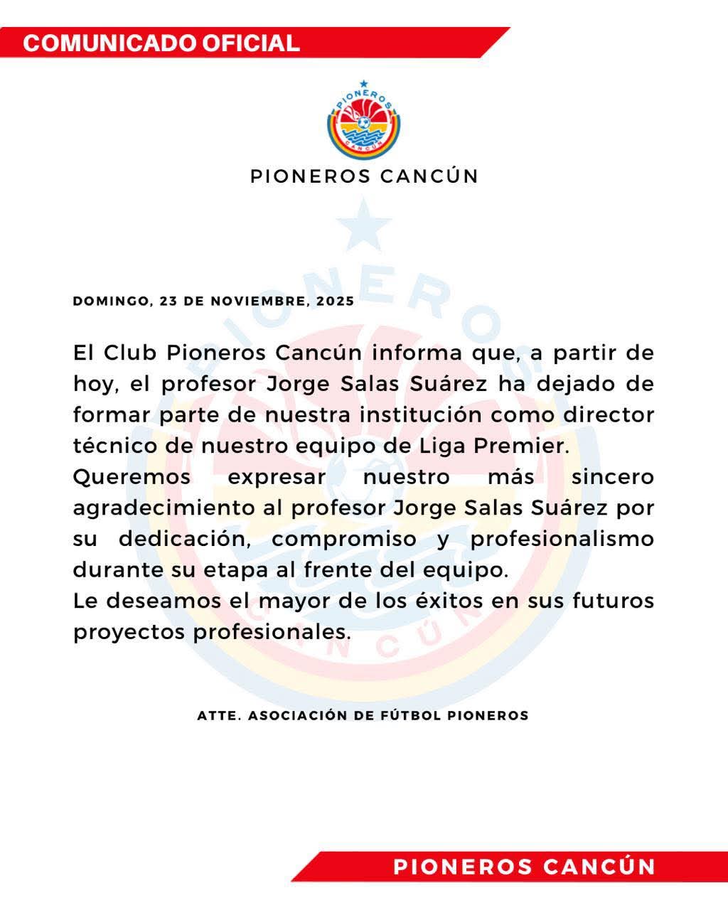 CANCÚN, Q. ROO a 24 de noviembre.- A poco más de 24 horas de que los Pioneros de Cancún cayeron 0-2 en casa frente a los Chapulineros de Oaxaca y alrededor de las nueve de la noche del domingo a través de un comunicado en sus redes sociales, la directiva cancunense encabezada por Daniel Arreola Argüello, hicieron pública la destitución del profesor Jorge Salas Suárez al frente del equipo perteneciente a la Serie A de la Liga Premier MX, justamente al finalizar la primera vuelta del Torneo 2025-26 del Grupo Tres.