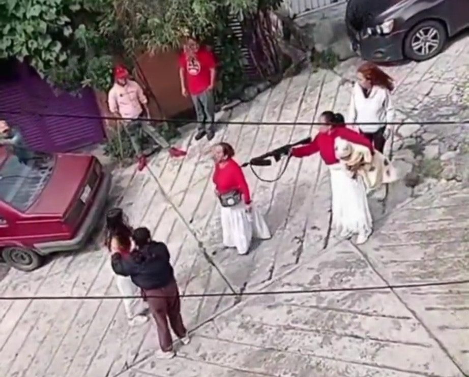 La grabación fue difundida por el periodista C4 Jiménez, quien exhibe que, aunque la mujer no dispara, sí usa el arma para disuadir a algunas de las personas en conflicto.
