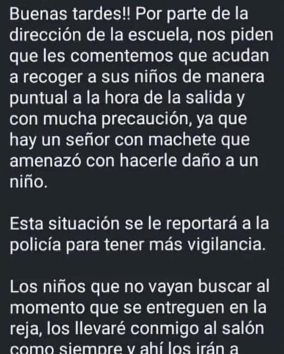 El mensaje advertía a los padres sobre la presencia de un hombre que supuestamente había amenazado con hacerle daño a un menor, por lo que se recomendaba recoger a los niños con precaución. También se mencionaba que la situación había sido informada a la policía.
