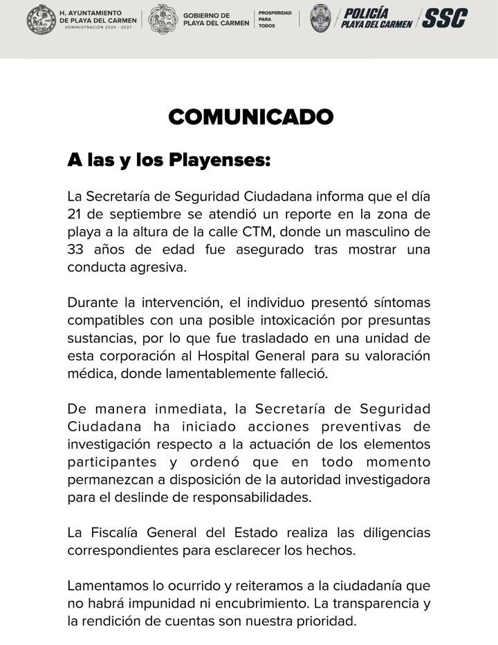 Luego de la muerte del hombre, el ayuntamiento encabezado por Estefanía Mercado Ascencio emitió apuradamente un comunicado para decir que “el día 21 de septiembre se atendió un reporte en la zona de playa a la altura de la calle CTM, donde un masculino de 33 años de edad fue asegurado tras mostrar una conducta agresiva.