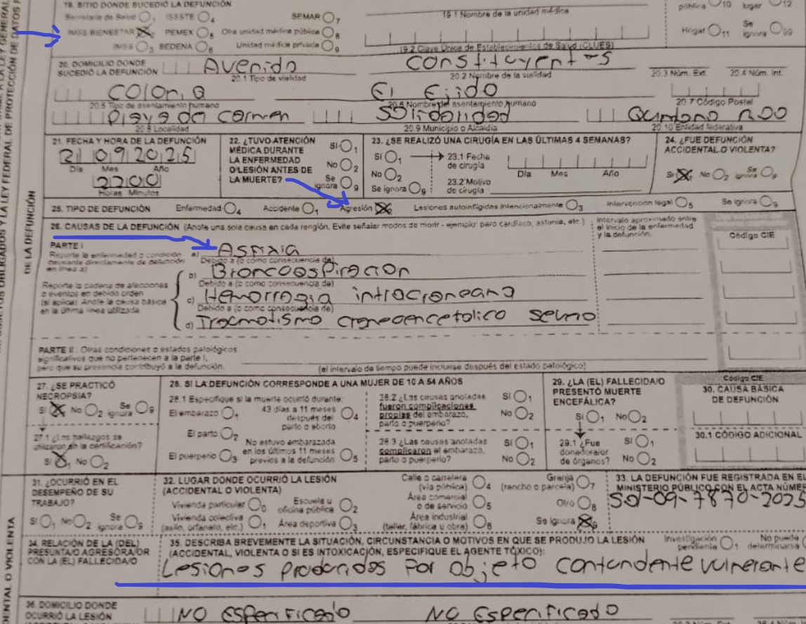 El resultado de la necropsia, de la cual se dio conocimiento al Diario Cambio 22, indica que las causas de la muerte de la persona fueron asfixia, broncoaspiración, hemorragia intracraneal y traumatismo creaneoencefálico severo, lo que refiere que fue golpeado gravemente en la cabeza.