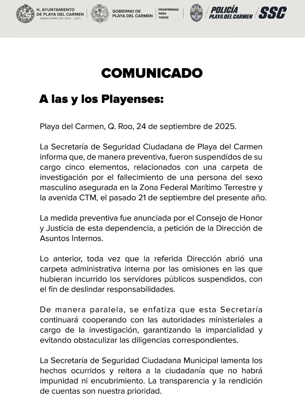 Ante esta situación y el conocimiento que ya tiene la familia sobre las causas de la muerte del pescador, al gobierno municipal de Playa del Carmen no le quedó otra que anunciar este miércoles que suspendió a cinco policías de la dependencia que hace poco tomó bajo su mando Carlos Montesinos García, por su relación con la carpeta de investigación abierta por el fallecimiento de esta persona.