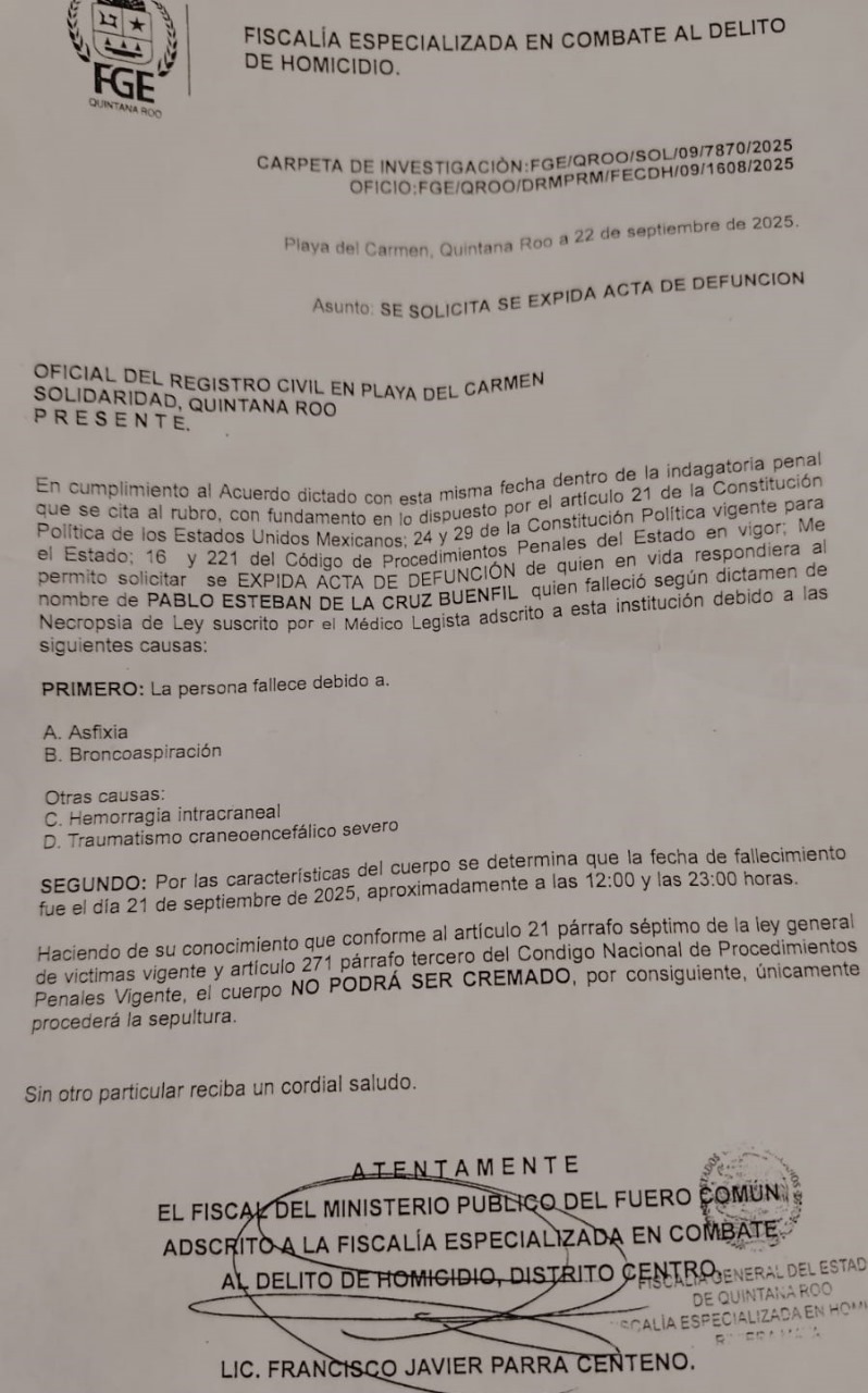 La fecha del fallecimiento fue el 21 de septiembre a las 22 horas, en el Hospital General de Playa del Carmen, ubicado en avenida Constituyentes colonia Ejido, indica el certificado expedido por la Secretaría de Salud.