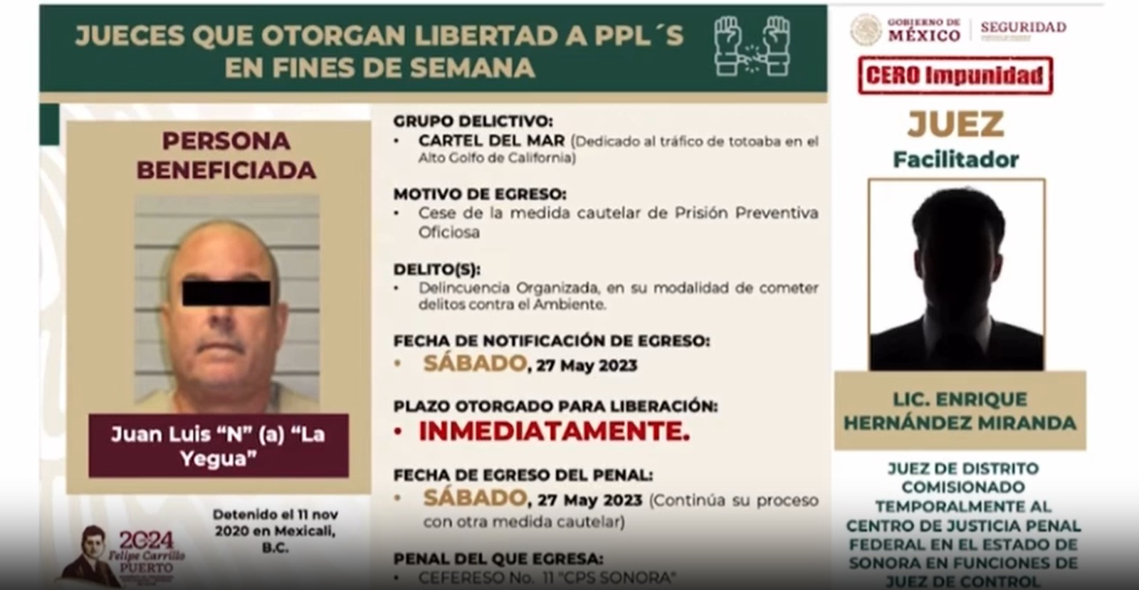Posteriormente, el 23 de julio de 2024, también en la mañanera de AMLO, Rodríguez Bucio hizo otra acusación contra el juez Hernández Miranda, quien liberó a un presunto miembro del crimen organizado en la modalidad de tráfico de especies: “El siguiente juez es el licenciado Enrique Hernández Miranda, favorece a Juan Luis ‘N’, alias ‘la Yegua’, él es de un cártel que se autodenomina Cártel del Mar, porque se dedican a traficar totoaba en el alto golfo de California. El motivo de su egreso fue cese de la medida cautelar y por delitos de delincuencia organizada en su modalidad de cometer delitos contra el ambiente. Se le notifica el sábado 27 de mayo que salga inmediatamente y sale precisamente también el sábado 27 de mayo, continúa su proceso precisamente con otra medida cautelar”.