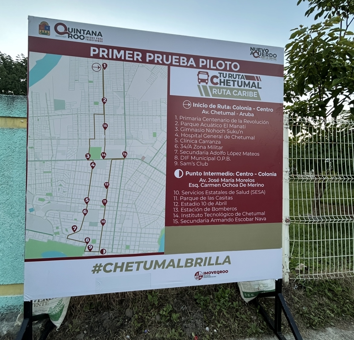 Los camiones realizarán el trayecto que saldrá desde la primaria Centenario de la Revolución conectando puntos estratégicos como el Parque Acuático El Manatí, el gimnasio Nohoch Suku’un, el Hospital General, la Clínica Carranza, la escuela secundaria “Adolfo López Mateos”, el DIF Othón P. Blanco, la XXIV Zona Militar, Sam’s Club, el Parque de las Casitas, el Instituto Tecnológico de Chetumal, el Zoológico Payo Obispo y la escuela secundaria Armando Escobar Nava, de 6 de la mañana a las 10 de la noche.