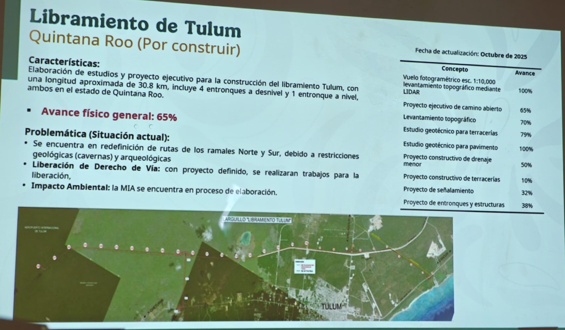 Para noviembre del 2025 la SICT decía tener 65 % de avance en este replanteamiento, pero ahora también tendrá que considerar en su nueva MIA que ya no solo está cerca la Reserva de la Biosfera de Sian Ka’an, sino que la ciudad de Tulum se encuentra actualmente rodeada de cinco áreas naturales protegidas.