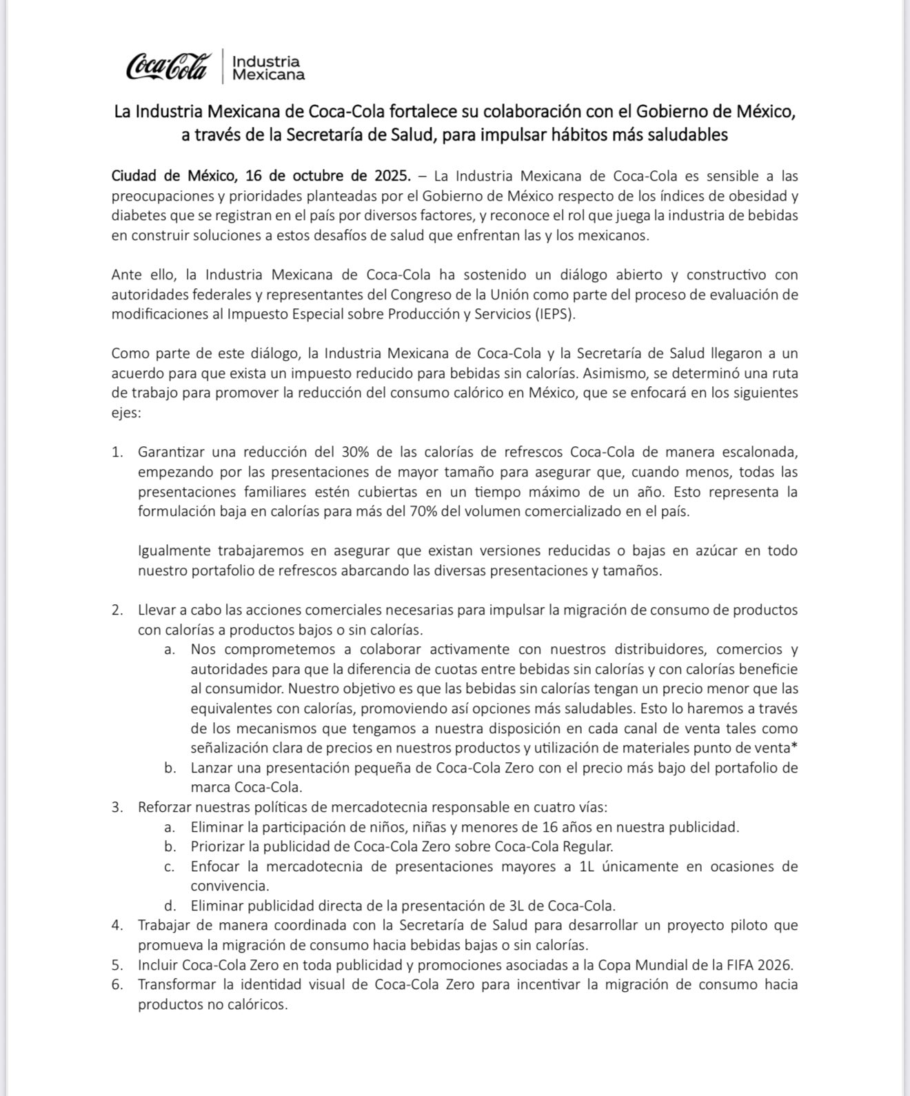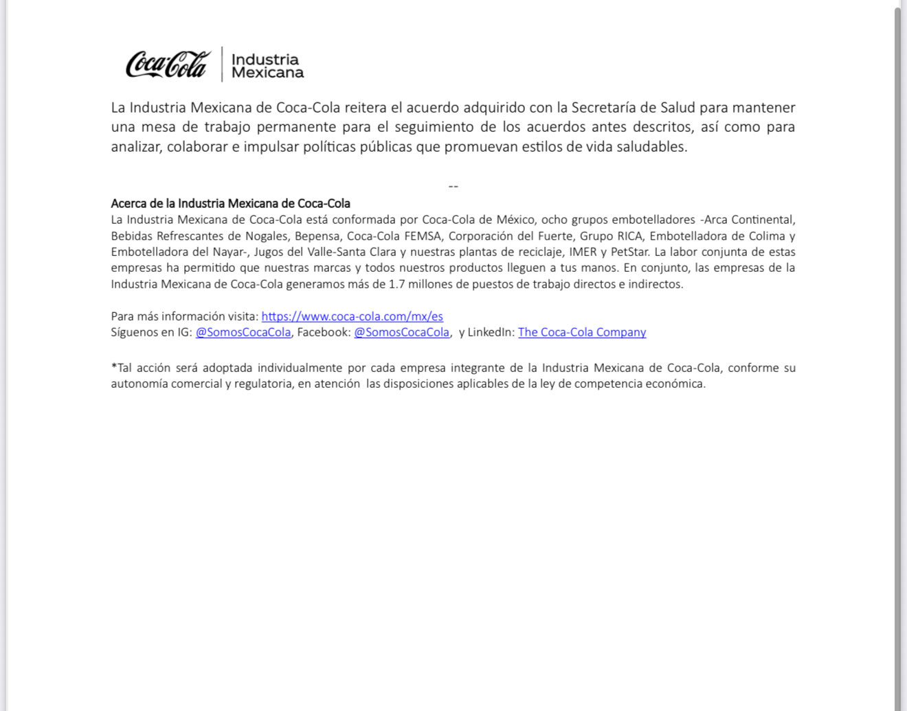 La industria refresquera emitió un comunicado en el que dice que se comprometen a: “Garantizar una reducción del 30% de las calorías de refrescos Coca-Cola de manera escalonada, empezando por las presentaciones de mayor tamaño, para asegurar que, cuando menos, todas las presentaciones familiares estén cubiertas en un tiempo máximo de un año. Esto representa la formulación baja en calorías para más del 70% del volumen comercializado en el país. Igualmente trabajaremos en asegurar que existan versiones reducidas o bajas en azúcar en todo nuestro portafolio de refrescos abarcando las diversas presentaciones y tamaños”.