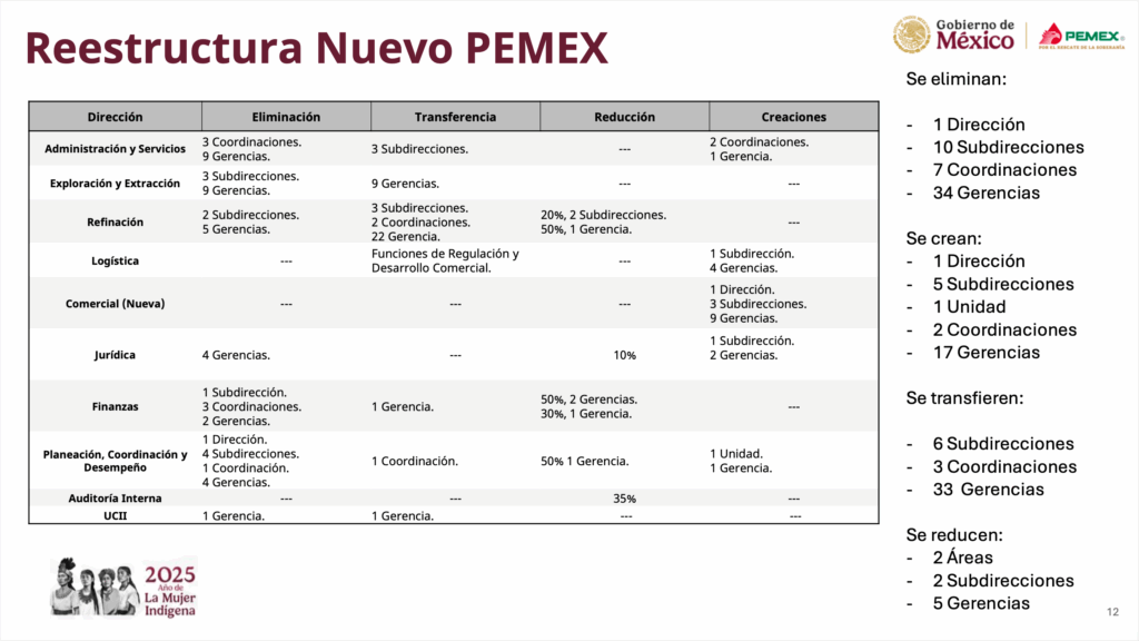 Además de la cancelación de plazas, los cambios en Pemex incluyen la verticalidad de la estructura, por lo que habrá una sola dirección general. En ese sentido, el documento interno indica que se eliminan: una dirección, 10 subdirecciones, siete coordinaciones y 34 gerencias; pero, al mismo tiempo, se crean: una dirección, cinco subdirecciones, una unidad, dos coordinaciones y 17 gerencias.
