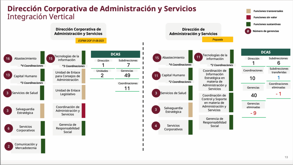 -En la Dirección Corporativa de Administración y Servicios, se transfieren tres subdirecciones (Unidad de Enlace con los Consejos de Administración, Unidad de Enlace Legislativo y Unidad de Comunicación y Mercadotecnia); se eliminan tres coordinaciones y nueve gerencias (Mercadotecnia, Nuevos Modelos de Abastecimiento, Sistemas Técnicos Especializados para Exploración y Producción, Inclusión, Apoyo Técnico y Normativo, Desempeño y Servicios al Personal, Alineación y Seguimiento Estratégico de Tecnologías de Información, Cumplimiento y Calidad de Servicio, Coordinación de Desarrollo Humano y Organizacional y Coordinación de Administración y Servicios); se crean dos coordinaciones y una gerencia (Coordinación de Información Estratégica en materia de Administración y Servicios, Coordinación de Control y Soporte en materia de Administración y Servicios, Asuntos Internos).