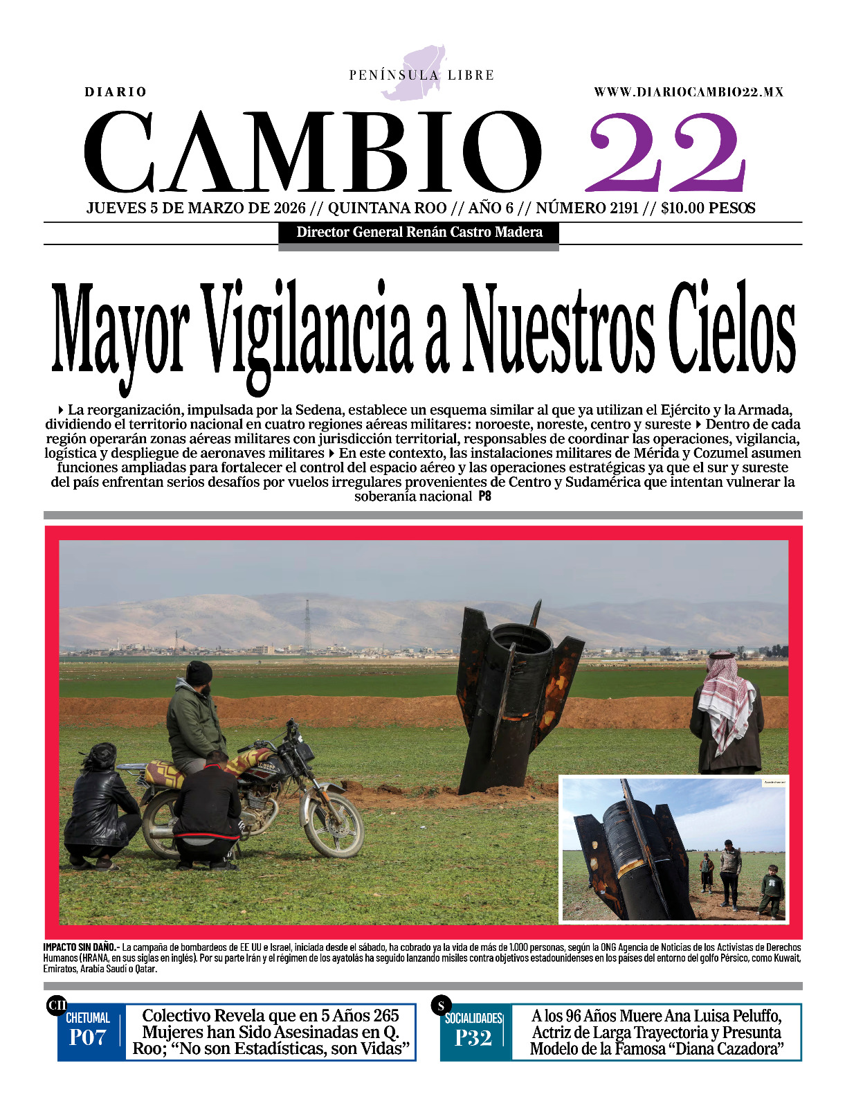 Portadas del Periódico CAMBIO 22 en su Edición Impresa del 05 de Marzo de 2026