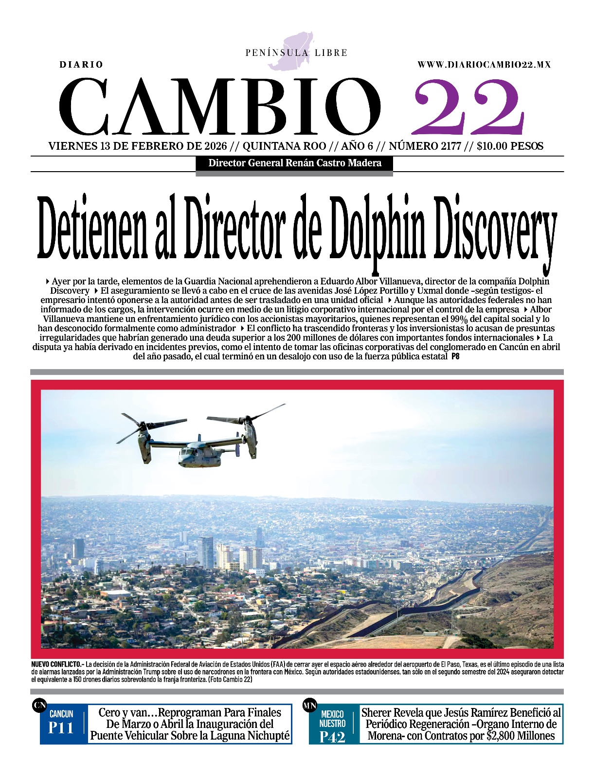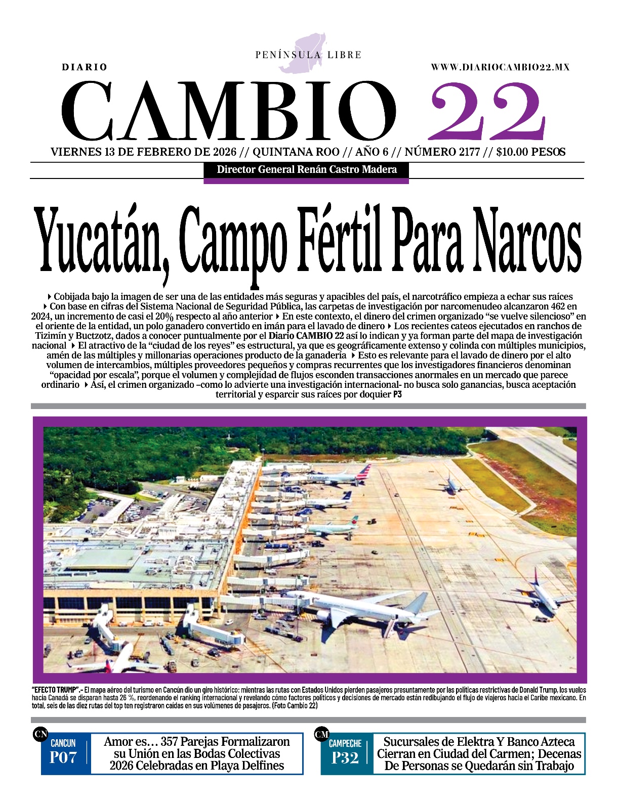 Portadas del Periódico CAMBIO 22 en su Edición Impresa del 13 de Febrero de 2026