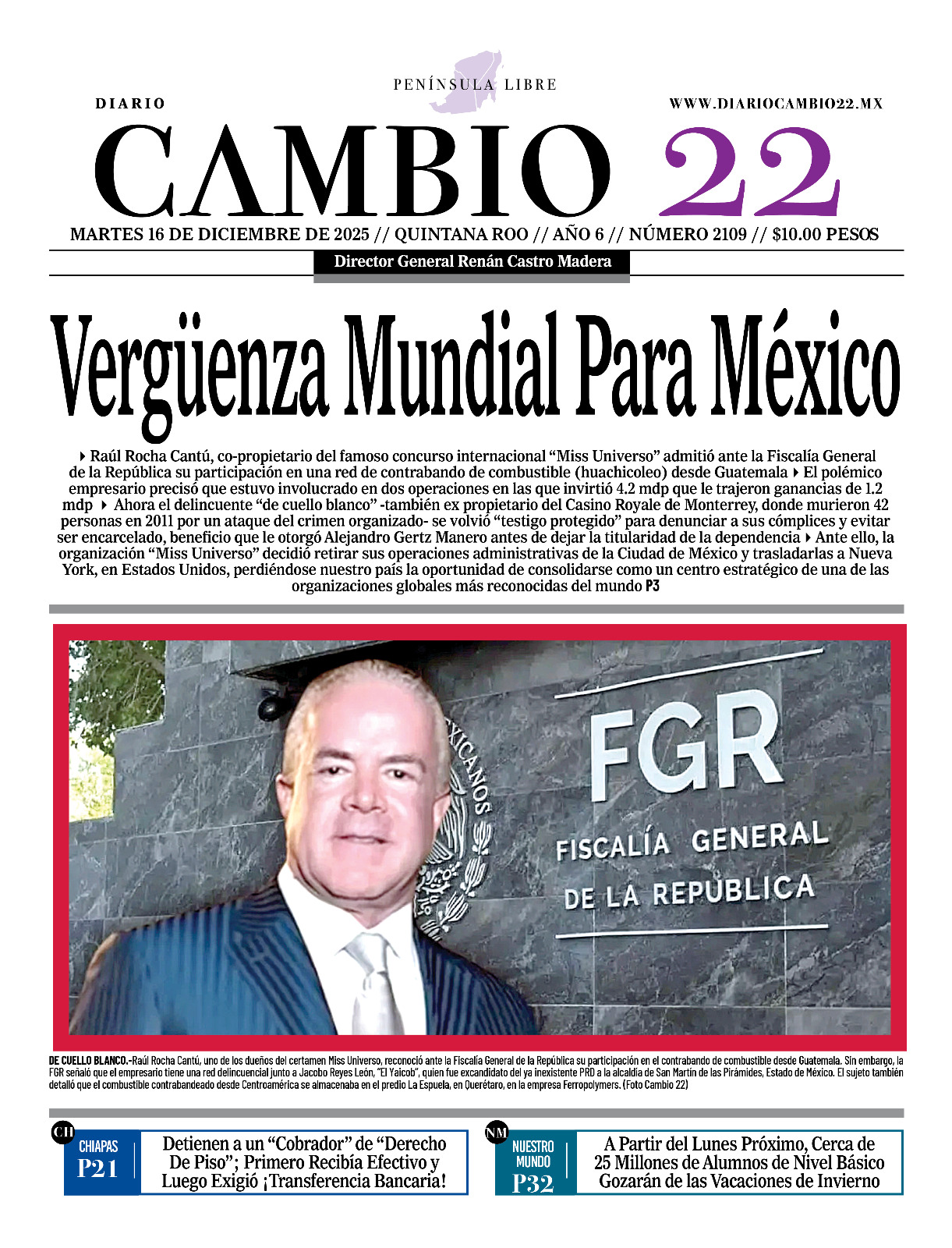Portadas del Periódico CAMBIO 22 en su Edición Impresa del 16 de Diciembre de 2025