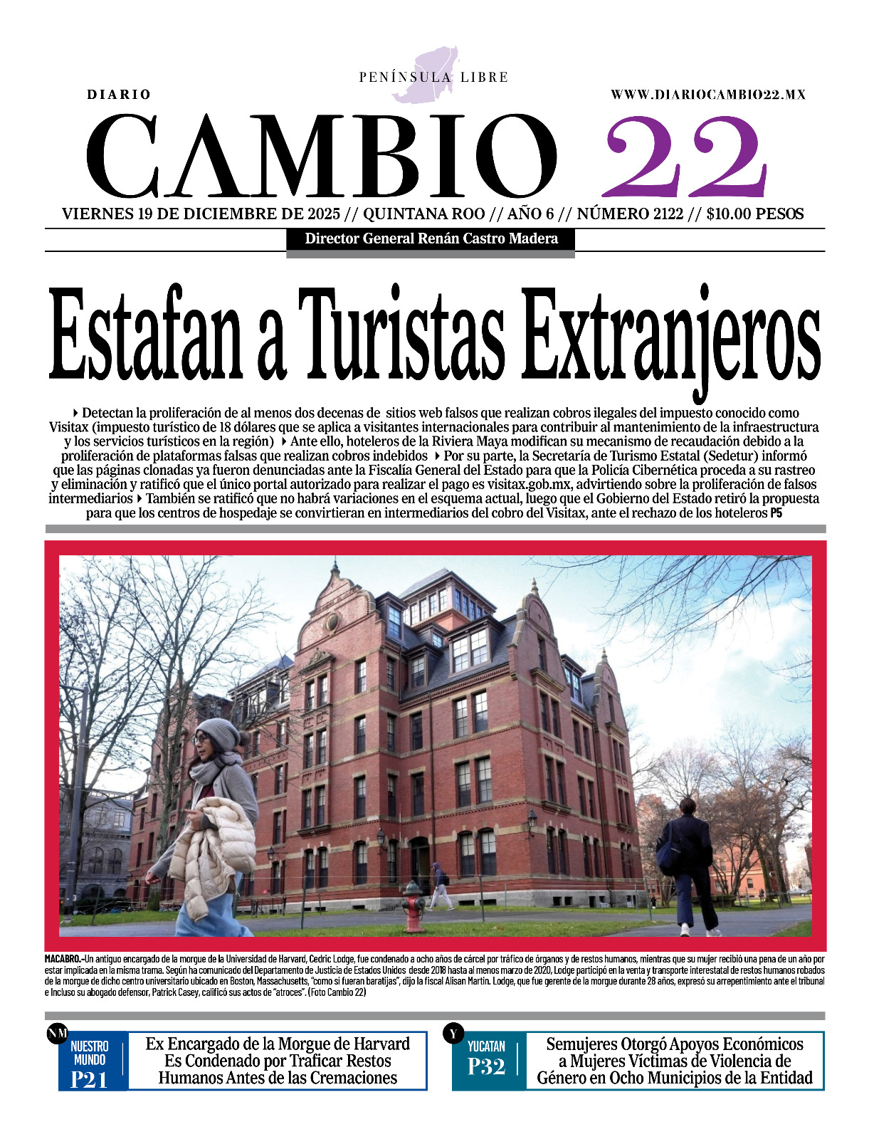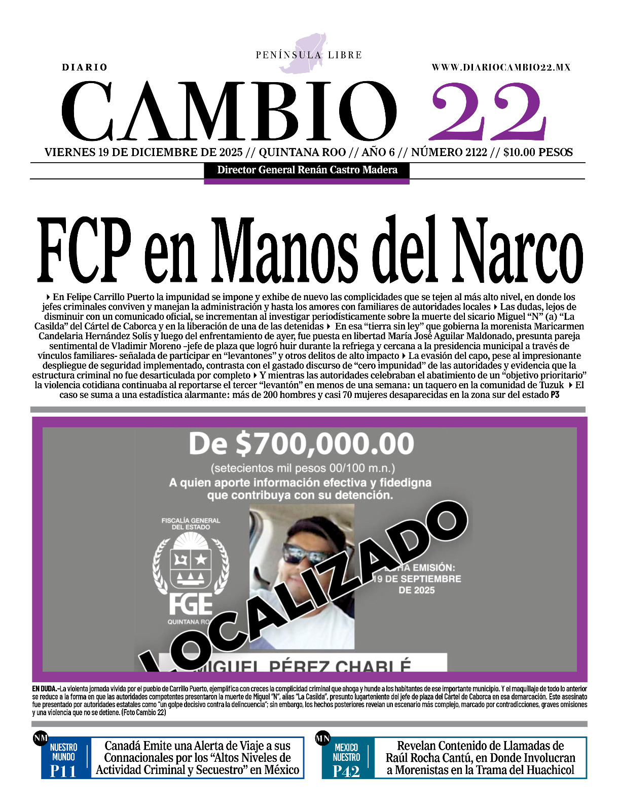Portadas del Periódico CAMBIO 22 en su Edición Impresa del 19 de Diciembre de 2025