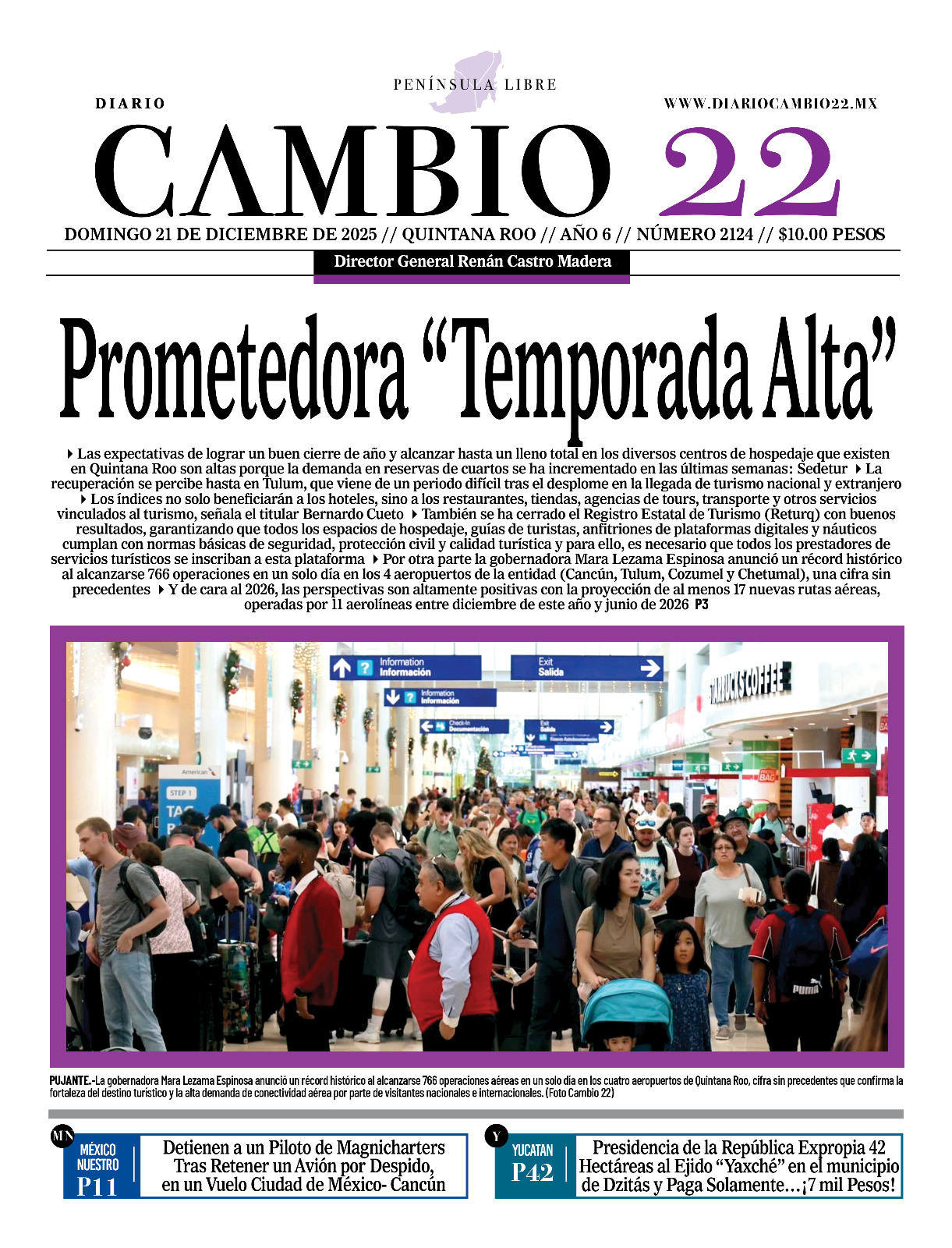 Portadas del Periódico CAMBIO 22 en su Edición Impresa del 21 de Diciembre de 2025