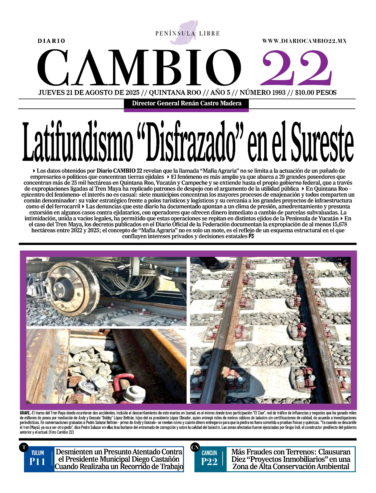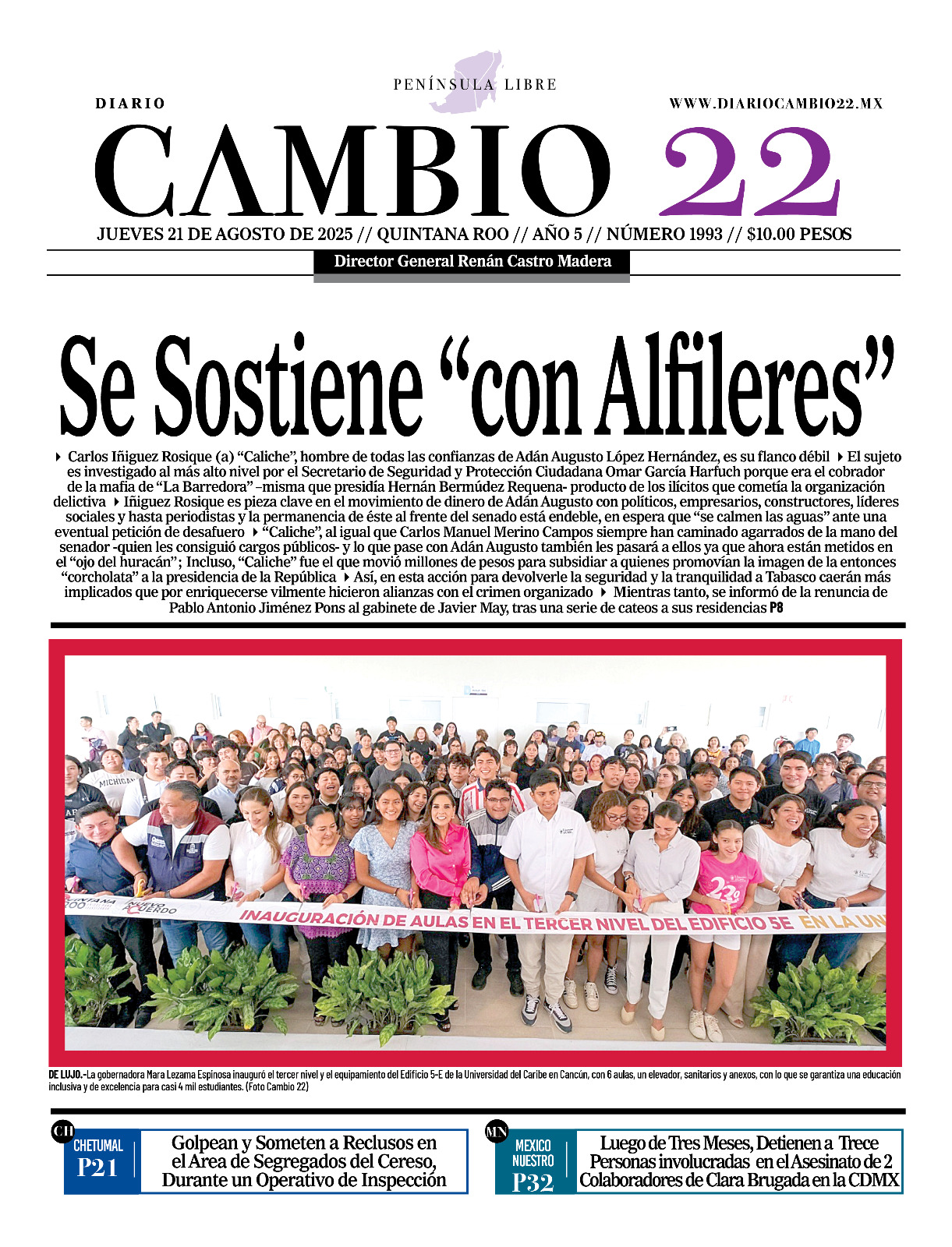 Portadas del Periódico CAMBIO 22 en su Edición Impresa del 21 de Agosto de 2025