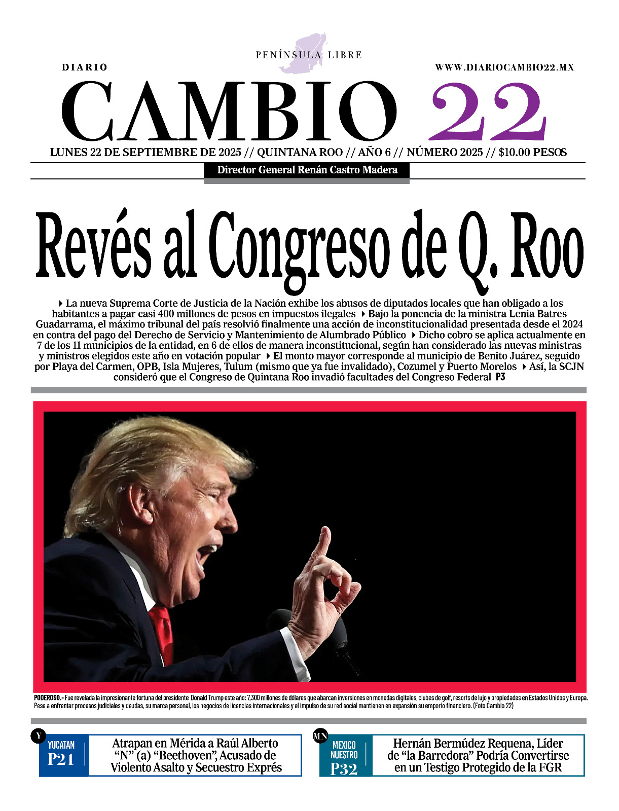 Portadas del Periódico CAMBIO 22 en su Edición Impresa del 22 de Septiembre de 2025