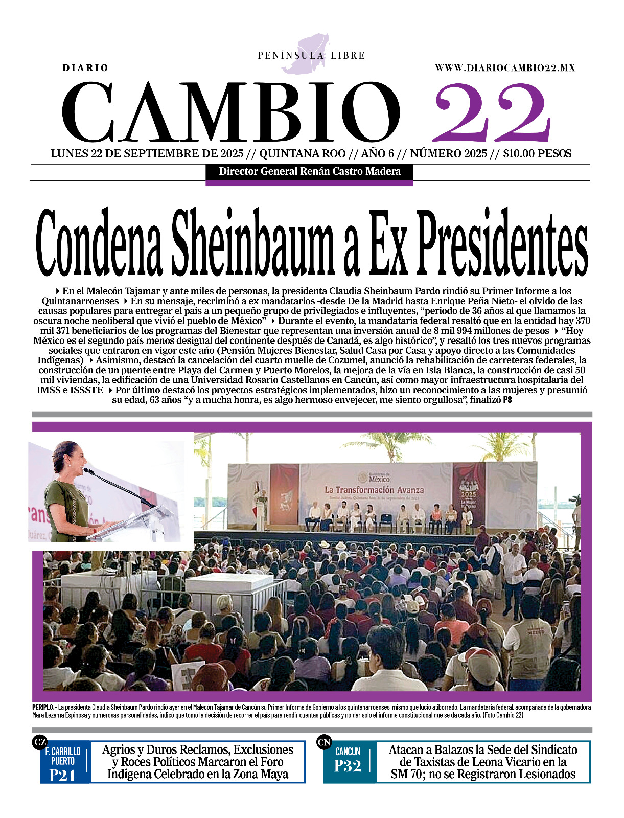 Portadas del Periódico CAMBIO 22 en su Edición Impresa del 22 de Septiembre de 2025