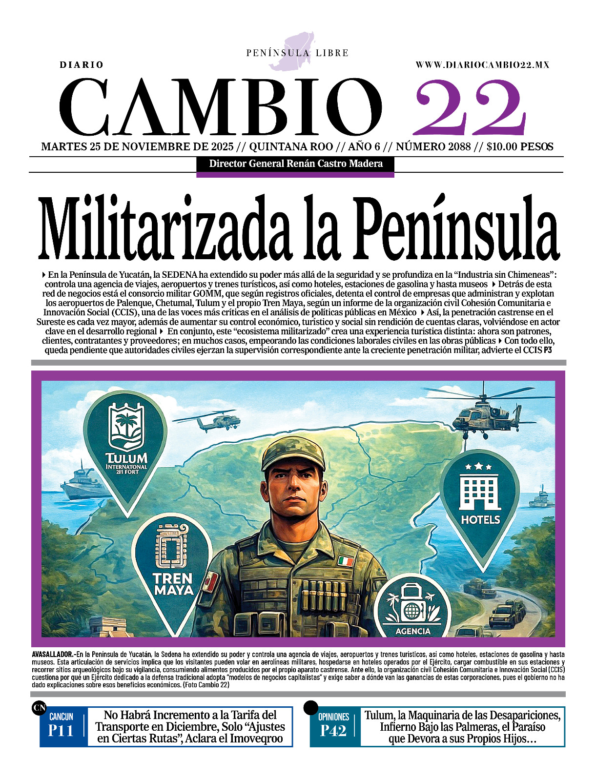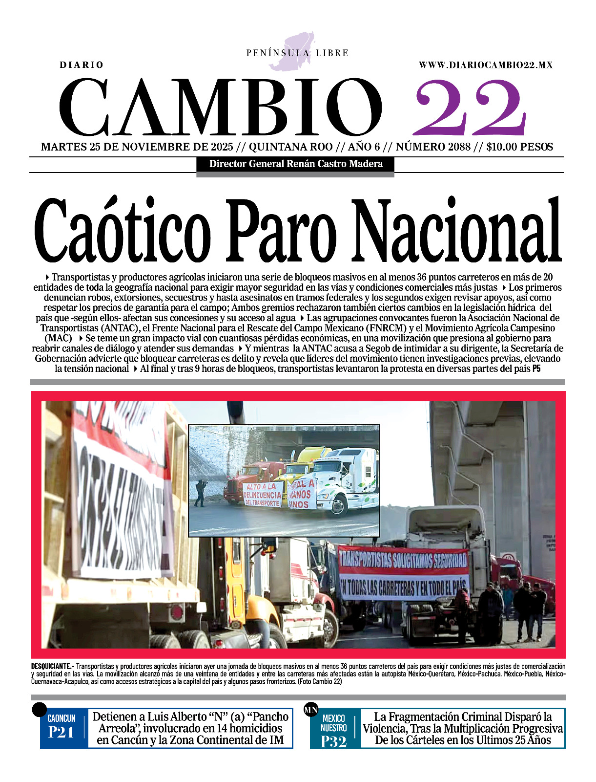 Portadas del Periódico CAMBIO 22 en su Edición Impresa del 25 de Noviembre de 2025