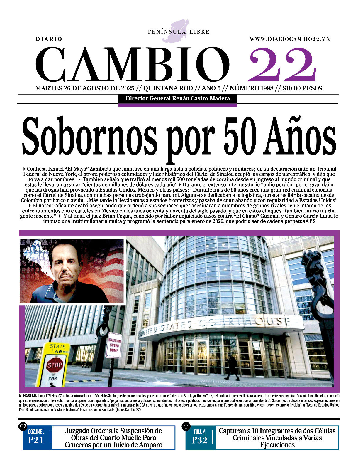 Portadas del Periódico CAMBIO 22 en su Edición Impresa del 26 de Agosto de 2025