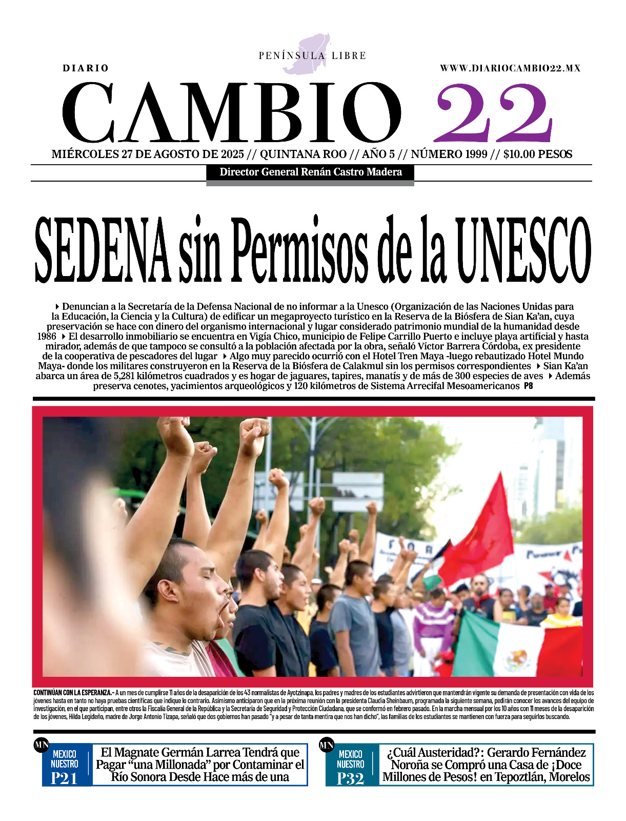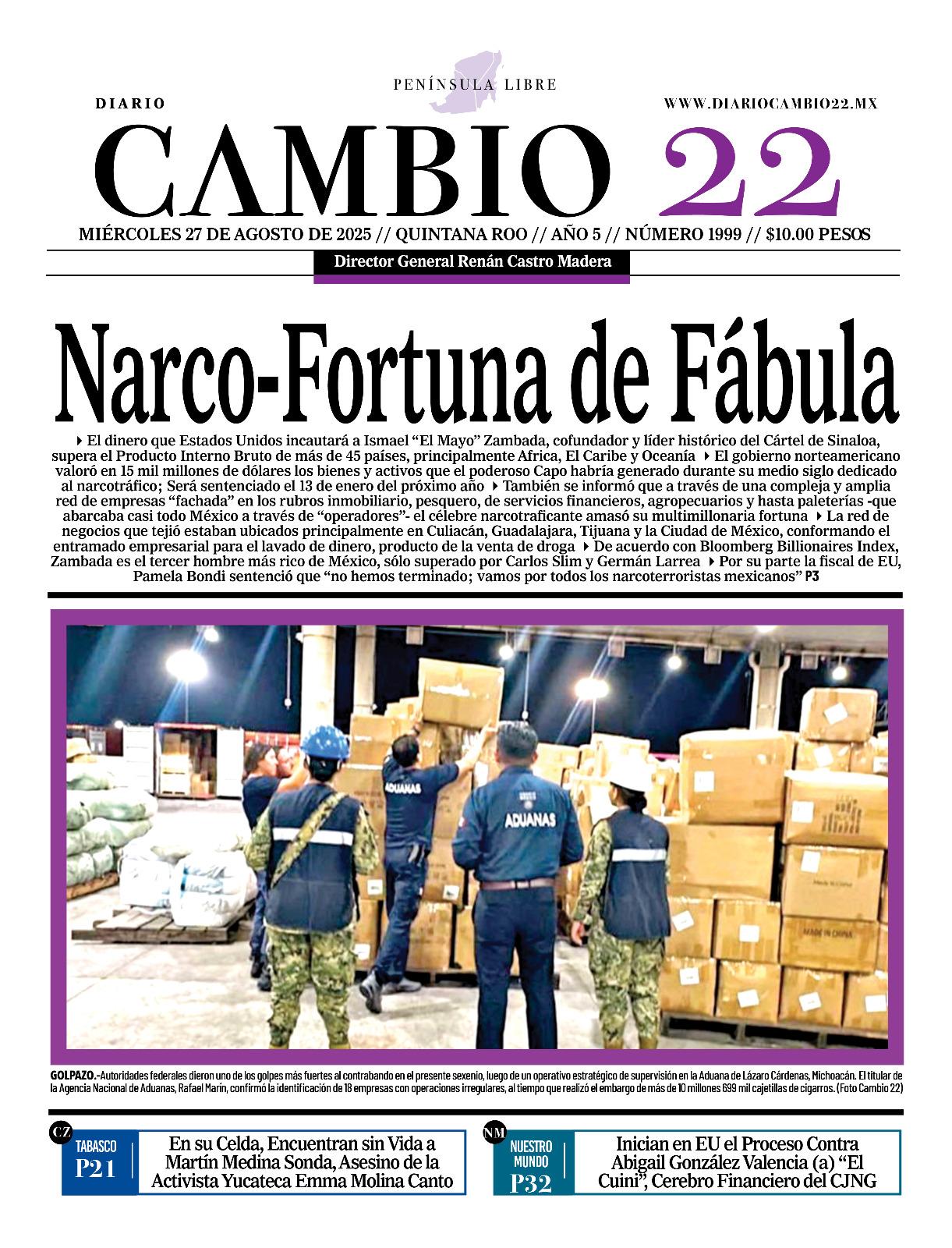 Portadas del Periódico CAMBIO 22 en su Edición Impresa del 27 de Agosto de 2025