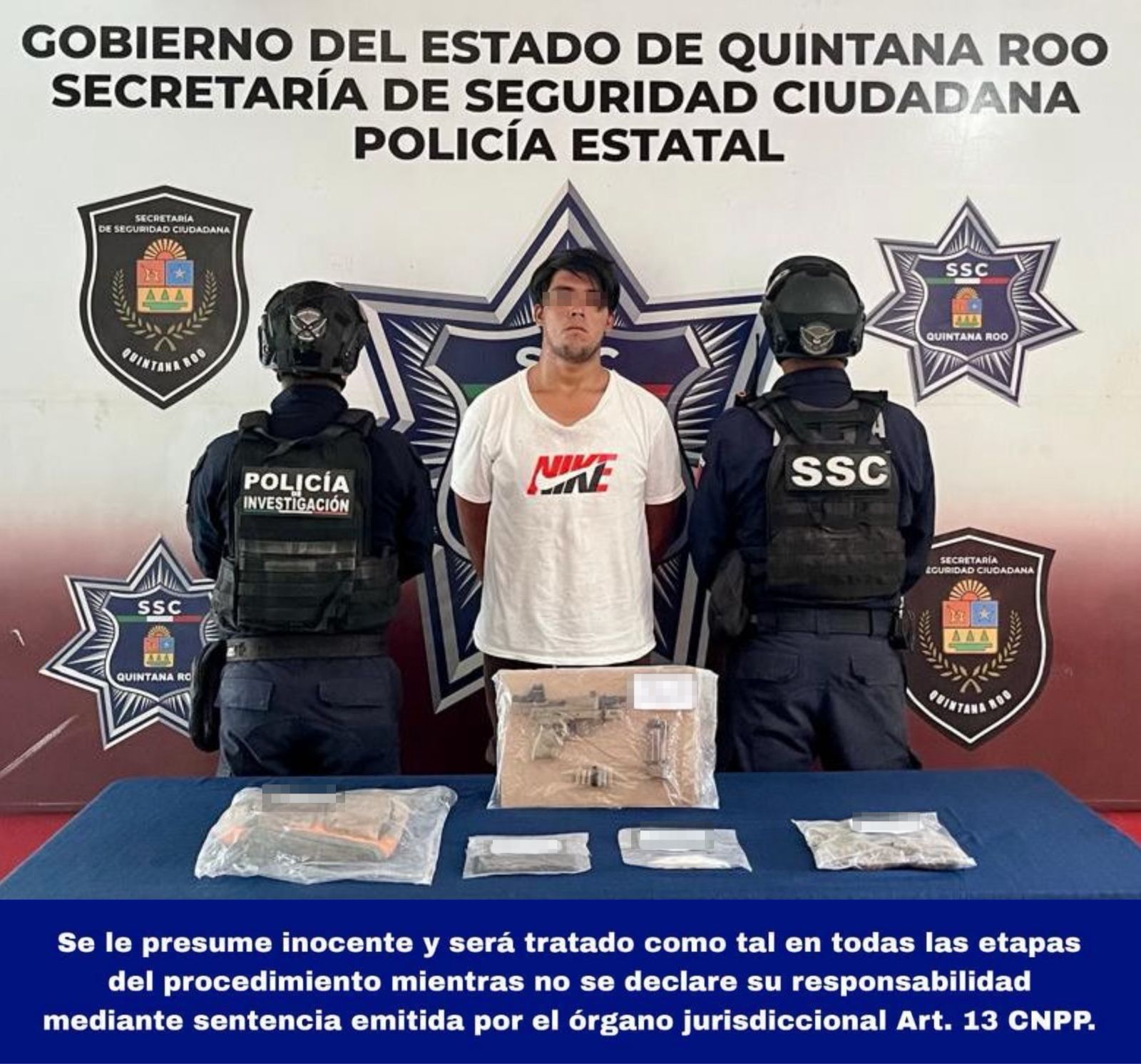 CANCÚN, Q. Roo, 22 de julio.- Un operativo de vigilancia rutinario derivó en la detención de un presunto operador del crimen organizado en la zona sur de Cancún, luego de que policías de la Secretaría de Seguridad Ciudadana del Estado interceptaran a un sujeto en posesión de un arma de fuego y cargamento de droga con características propias del narcomenudeo.