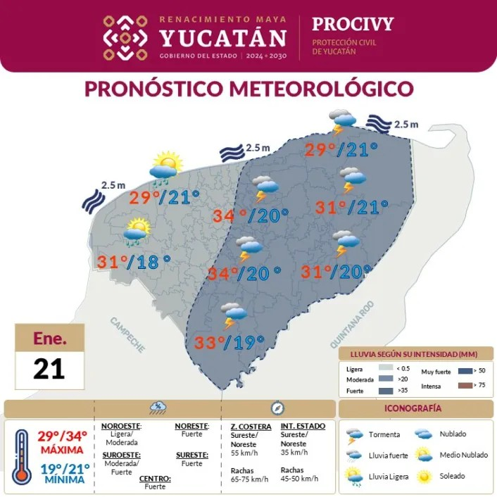 MÉRIDA, YUCATÁN, 21 de enero de 2025.- El Servicio Meteorológico Nacional (SMN), dependiente de la Comisión Nacional del Agua (Conagua), ha emitido un aviso actualizado a las 06:00 horas sobre las condiciones meteorológicas para este martes.