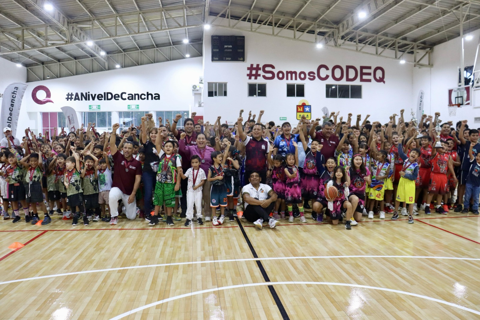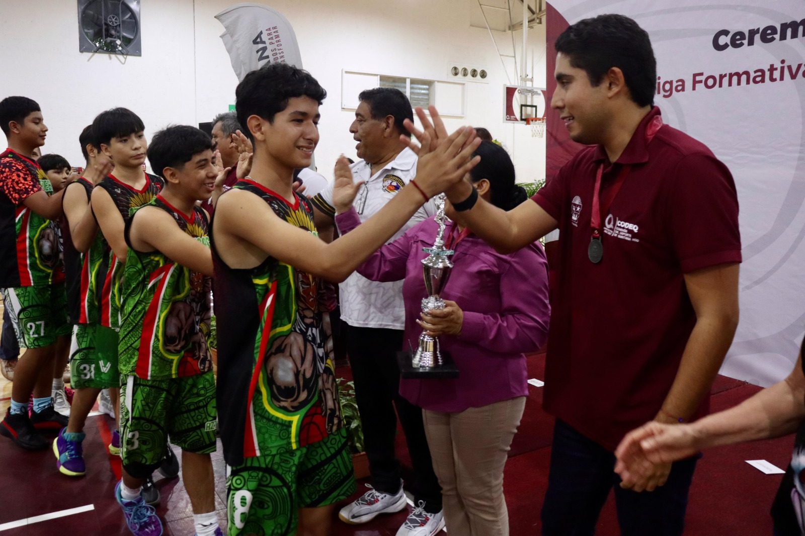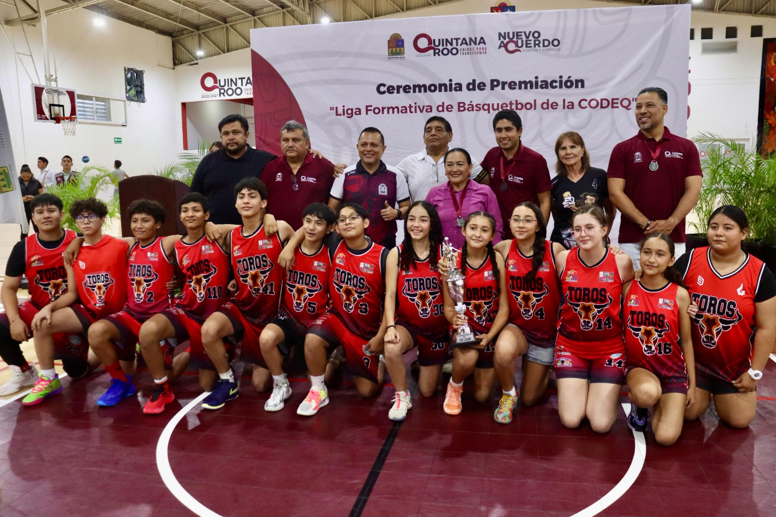 En medio de una colorida ceremonia, ambientada por entusiastas niñas, niños y jóvenes en el renovado Gimnasio “Nohoch Suku’n”, se realizó con éxito la premiación de la Liga Formativa de Básquetbol de la CODEQ, un espacio en el que compiten alrededor de 350 jugadores y que estuvo encabezado por Elda Xix Euán, secretaria de Educación en Quintana Roo y Jacobo Arzate Hop, presidente de la Comisión del Deporte de Quintana Roo (CODEQ).