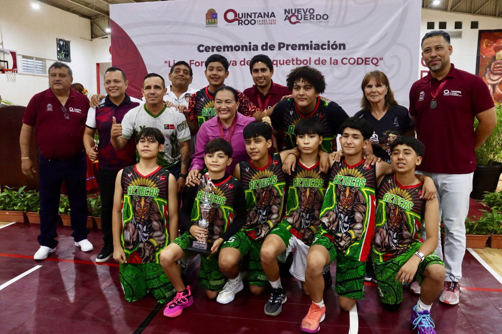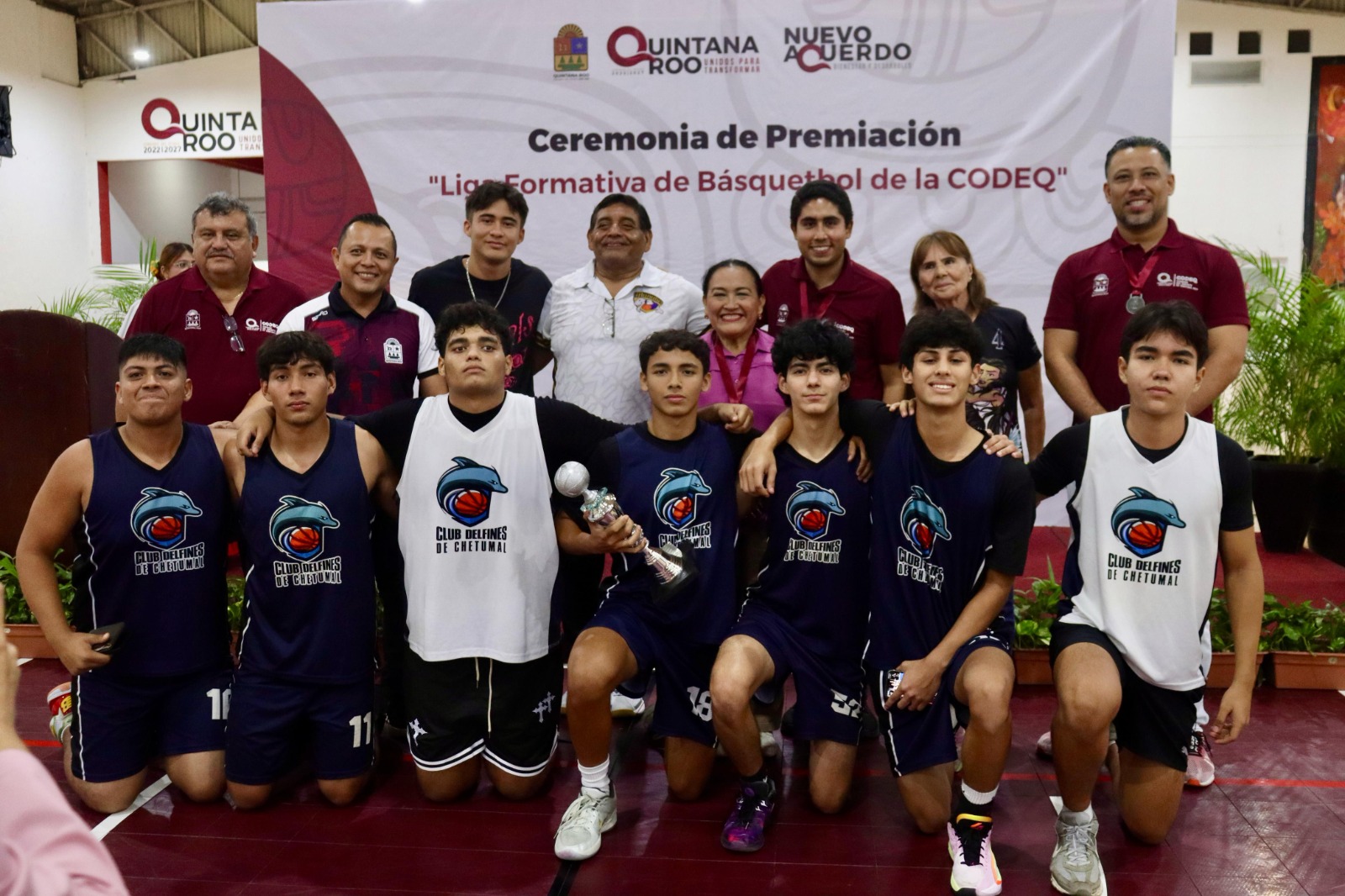 En medio de una colorida ceremonia, ambientada por entusiastas niñas, niños y jóvenes en el renovado Gimnasio “Nohoch Suku’n”, se realizó con éxito la premiación de la Liga Formativa de Básquetbol de la CODEQ, un espacio en el que compiten alrededor de 350 jugadores y que estuvo encabezado por Elda Xix Euán, secretaria de Educación en Quintana Roo y Jacobo Arzate Hop, presidente de la Comisión del Deporte de Quintana Roo (CODEQ).